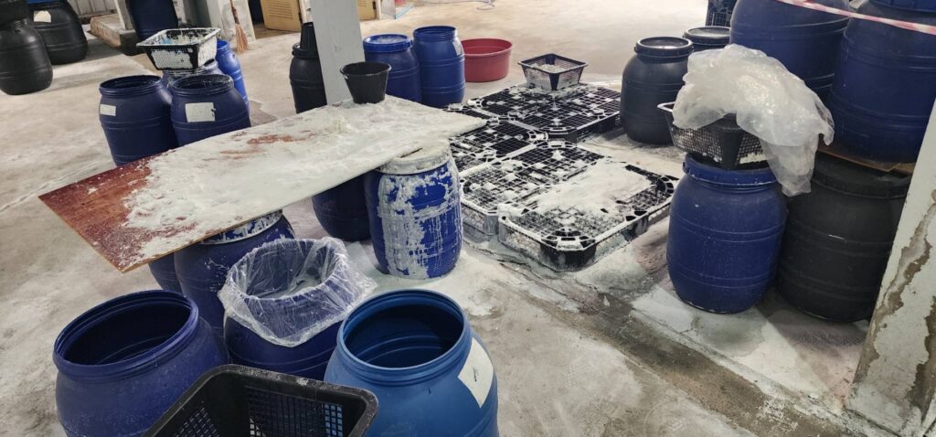 สถานที่ตรวจค้น โกดังไม่มีชื่อ เลขที่ 340 หมู่ 2 ตำบลอ้อมน้อย อำเภอกระทุ่มแบน จังหวัดสมุทรสาคร ตามหมายค้นศาลจังหวัดสมุทรสาคร ที่ ค.152/2568 ลงวันที่ 22 เมษายน 2568