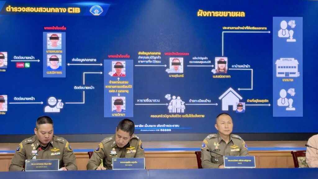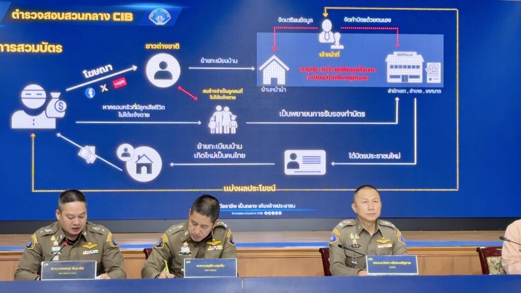 พล.ต.ต.วิทยา เปิดเผยว่า คดีนี้สืบเนื่องจากการรับแจ้งจากพลเมืองดีเมื่อเดือน เม.ย. 2568 ว่ามีการโพสต์โฆษณารับทำบัตรประชาชนไทย ผ่านแพลตฟอร์มโซเชียลของจีน “เสี่ยวหงซู (XHS)” เจ้าหน้าที่จึงสืบสวนจนพบขบวนการสวมบัตร โดยแบ่งหน้าที่เป็น 2 กลุ่ม คือ กลุ่มนายหน้า ทำหน้าที่ติดต่อ รับเงิน และพาผู้ต้องหาไปสวมบัตร และ กลุ่มเจ้าหน้าที่รัฐ ทำหน้าที่ย้ายทะเบียนบ้าน–ออกเอกสารราชการอันเป็นเท็จ ก่อนหน้านี้ เมื่อวันที่ 23 ก.ค. 2568 เจ้าหน้าที่สามารถจับกุมผู้เกี่ยวข้องได้แล้ว 9 ราย และยึดหลักฐานจำนวนมาก กระทั่งขยายผลจนศาลอาญาคดีทุจริตฯ ภาค 1 ออกหมายจับผู้ต้องหาเพิ่มเติม 10 รายในครั้งนี้