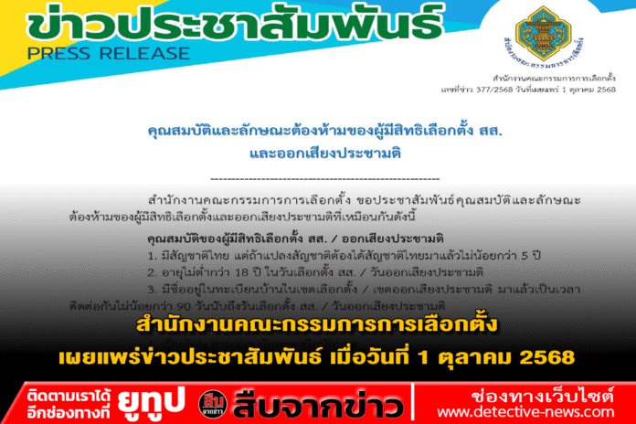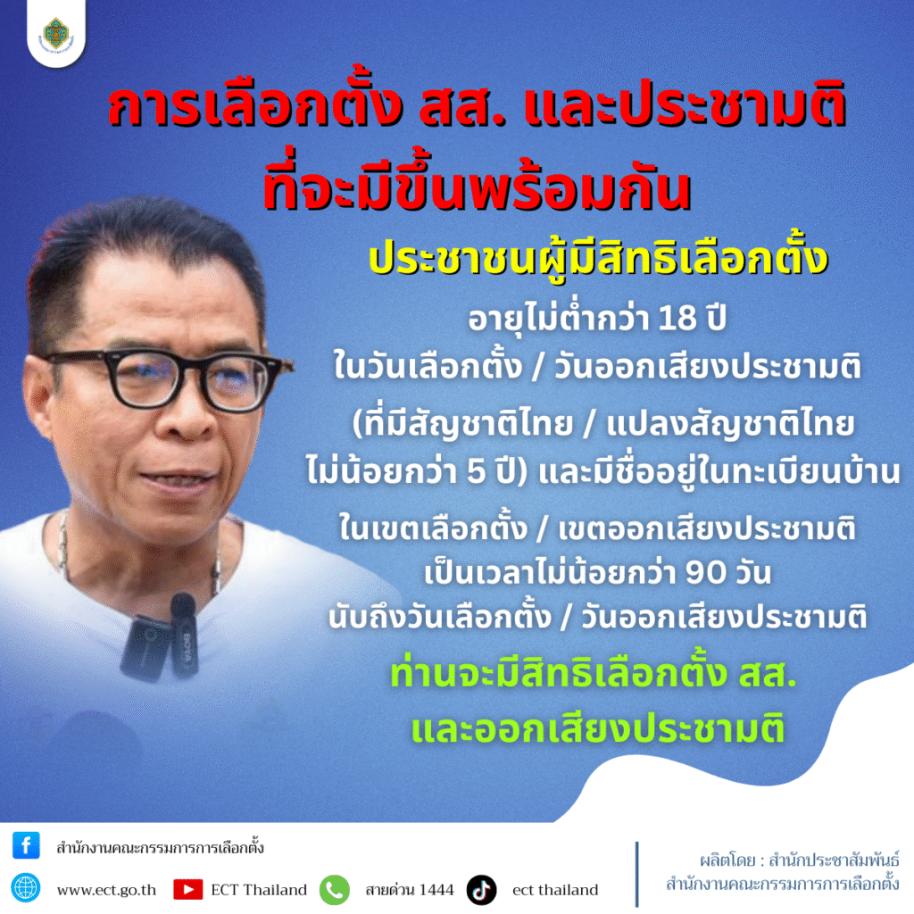 คุณสมบัติและลักษณะต้องห้ามของผู้มีสิทธิเลือกตั้ง สส. และออกเสียงประชามติ สำนักงานคณะกรรมการการเลือกตั้ง ขอประชาสัมพันธ์คุณสมบัติและลักษณะต้องห้ามของผู้มีสิทธิเลือกตั้งและออกเสียงประชามติที่เหมือนกันดังนี้