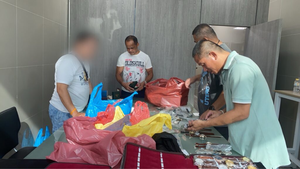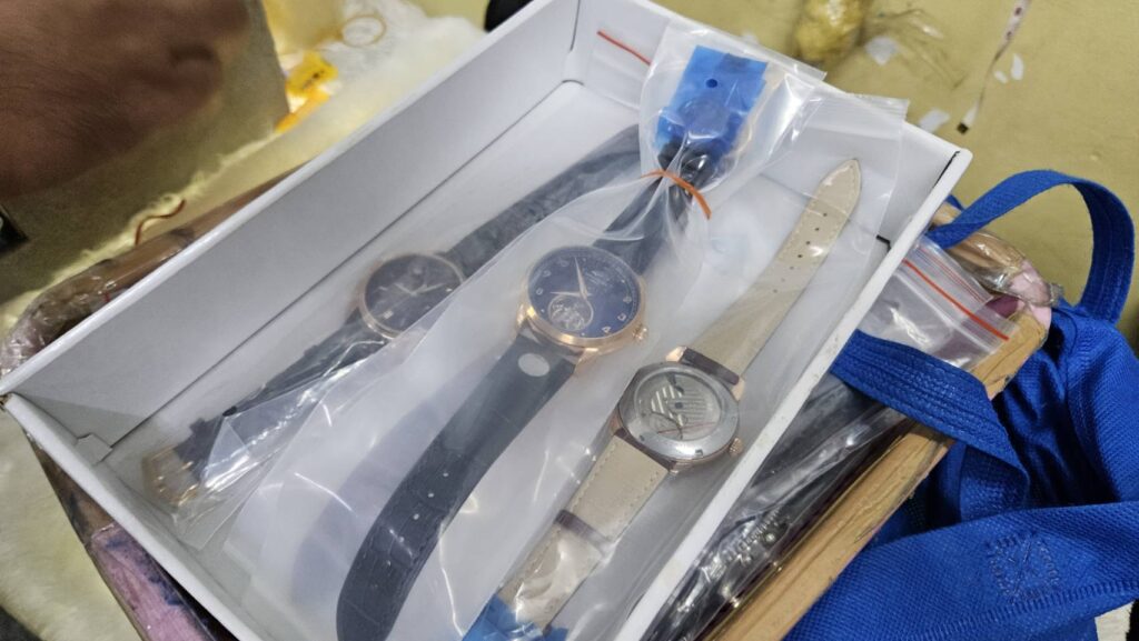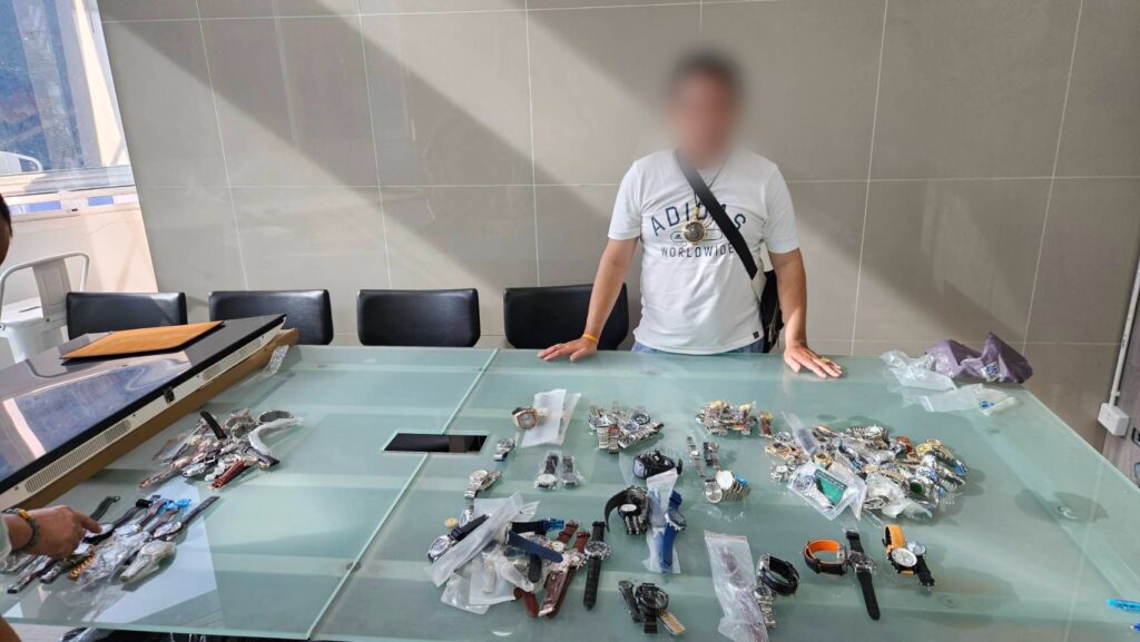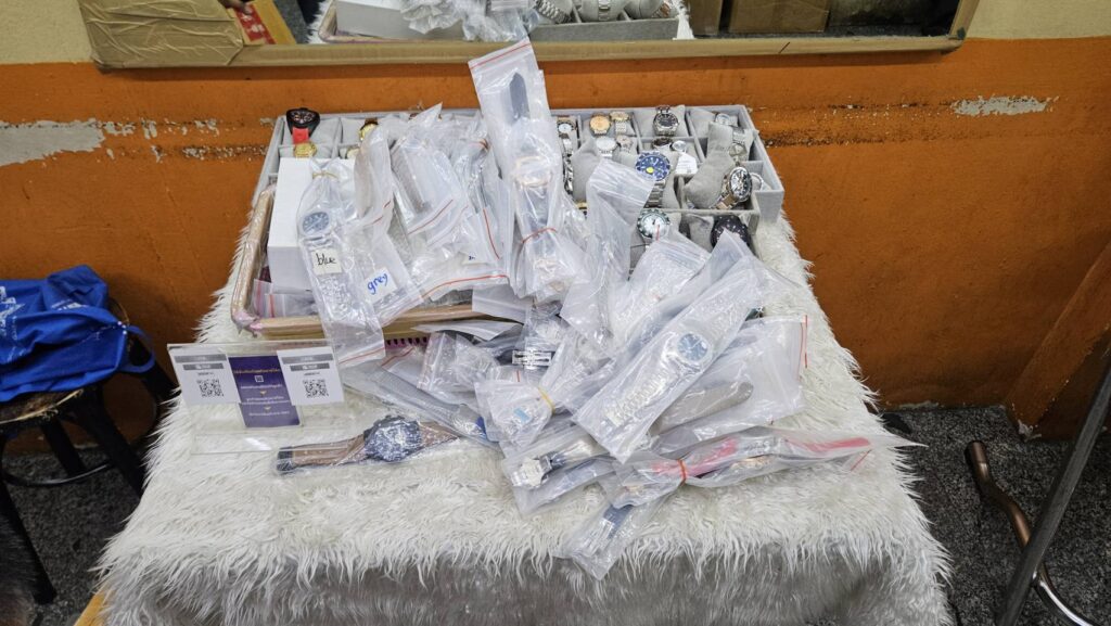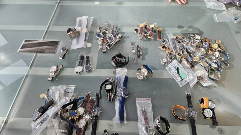 เจ้าหน้าที่ได้ตรวจยึดนาฬิกาปลอมเครื่องหมายการค้าไว้เป็นของกลางรวมจำนวน 809 ชิ้น ครอบคลุมแบรนด์หรูระดับโลกกว่า 20 รายการ อาทิ TAG Heuer, Panerai, Patek Philippe, Rolex, Hublot, Omega, Audemars Piguet, Louis Vuitton และอื่นๆ อีกมากมาย ซึ่งนาฬิกาส่วนใหญ่ถูกซุกซ่อนไว้ภายในร้านค้าดังกล่าว