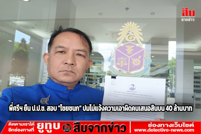 วันที่ 3 ต.ค. 68 นายศรีสุวรรณ จรรยา ผู้นำองค์กรรักชาติ รักแผ่นดิน ได้เดินทางไปยังสำนักงานคณะกรรมการป้องกันและปราบปรามการทุจริตแห่งชาติ (ป.ป.ช.) เพื่อยื่นคำร้องขอให้ไต่สวนและชี้มูล นายไชยชนก ชิดชอบ รัฐมนตรีว่าการกระทรวงดิจิทัลเพื่อเศรษฐกิจและสังคม (ดีอี) กรณีที่นายไชยชนกเปิดเผยกลางรัฐสภาว่าถูกเสนอเงิน 40 ล้านบาทต่อเดือน เพื่อแลกกับการไม่ดำเนินคดีกับกลุ่มคอลเซ็นเตอร์ สแกมเมอร์ และเว็บไซต์ผิดกฎหมาย แต่กลับไม่ได้ไปแจ้งความดำเนินคดีกับผู้เสนอสินบนดังกล่าว