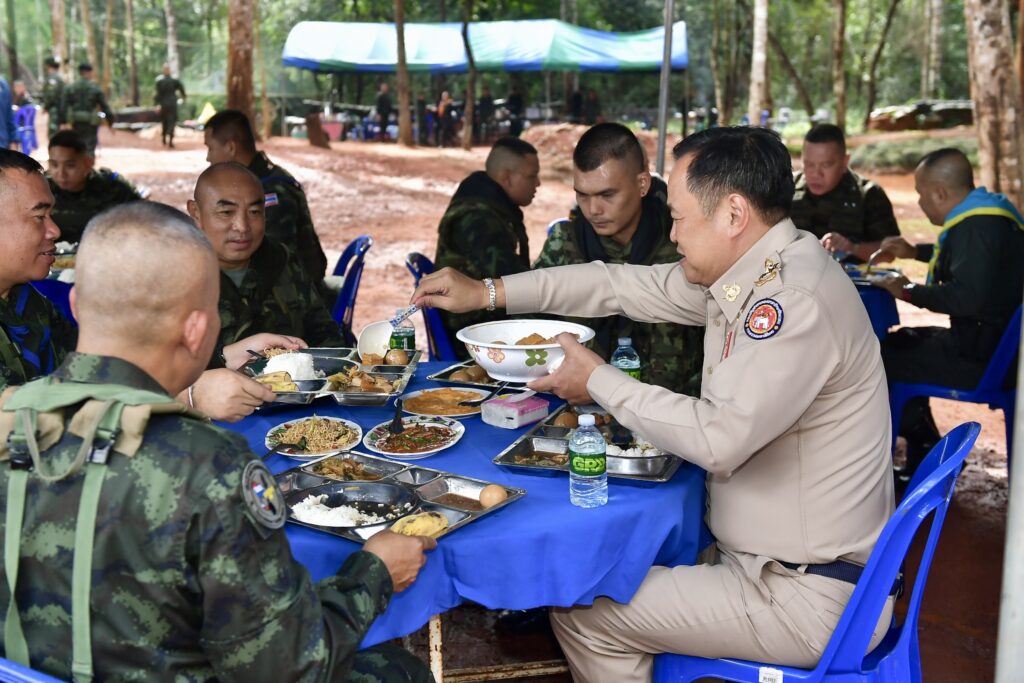 จากนั้น นายกรัฐมนตรี ได้ร่วมรับประทานอาหารกลางวันร่วมกับกำลังพล โดยเมนูอาหารในครั้งนี้ประกอบด้วย ไข่พะโล้ ยำปลากระป๋อง ต้มจับฉ่ายกระดูกอ่อน ผัดมาม่า พร้อมด้วยเมนูของหวาน อาทิ กล้วยน้ำว้า เครื่องดื่ม น้ำชาและกาแฟ โดยช่วงหนึ่ง นายกรัฐมนตรี ได้ตักไข่พะโล้ให้กับนายทหารที่นั่งร่วมโต๊ะ ด้วยบรรยากาศอย่างเป็นกันเอง