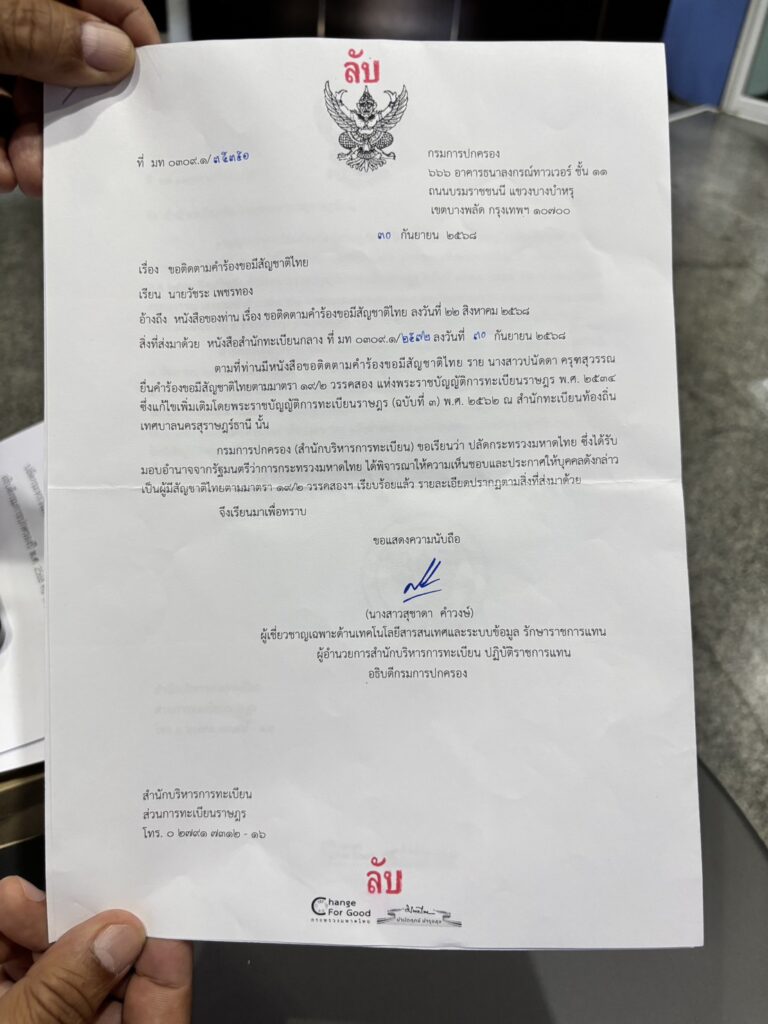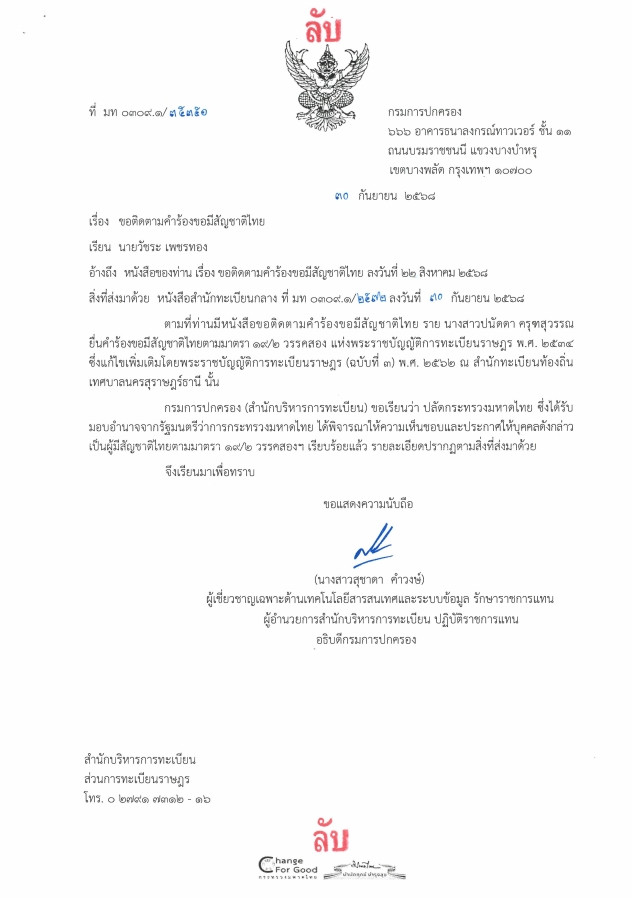 กรมการปกครอง (สำนักบริหารการทะเบียน) ขอเรียนว่า ปลัดกระทรวงมหาดไทย ซึ่งได้รับมอบอำนาจจากรัฐมนตรีว่าการกระทรวงมหาดไทย ได้พิจารณาให้ความเห็นชอบและประกาศให้บุคคลดังกล่าวเป็นผู้มีสัญชาติไทยตามมาตรา 19/2 วรรคสองฯ เรียบร้อยแล้ว