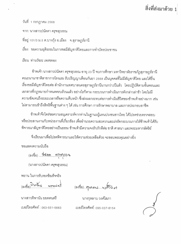 7 ตุลาคม 2568 นายวัชระ เพชรทอง อดีตสส.พรรคประชาธิปัตย์ กล่าวว่า กรมการปกครอง กระทรวงมหาดไทยได้มีหนังสือเลขที่ มท 0309.1/35351 ลงวันที่ 30 กันยายน 2568 เรื่อง ขอติดตามคำร้องขอมีสัญชาติไทย ตามที่ท่านมีหนังสือขอติดตามคำร้องขอมีสัญชาติไทย ราย นางสาวปนัดดา ครุฑสุวรรณ ยื่นคำร้องขอมีสัญชาติไทยตามมาตรา 19/2 วรรคสอง แห่งพระราชบัญญัติการทะเบียนราษฎร พ.ศ. 2534 ซึ่งแก้ไขเพิ่มเติมโดยพระราชบัญญัติการทะเบียนราษฎร (ฉบับที่ 3) พ.ศ. 2562 ณ สำนักทะเบียนท้องถิ่นเทศบาลนครสุราษฎร์ธานี นั้น