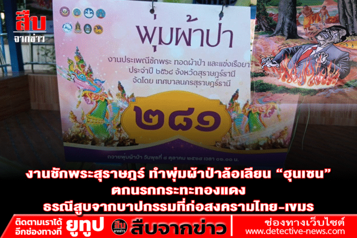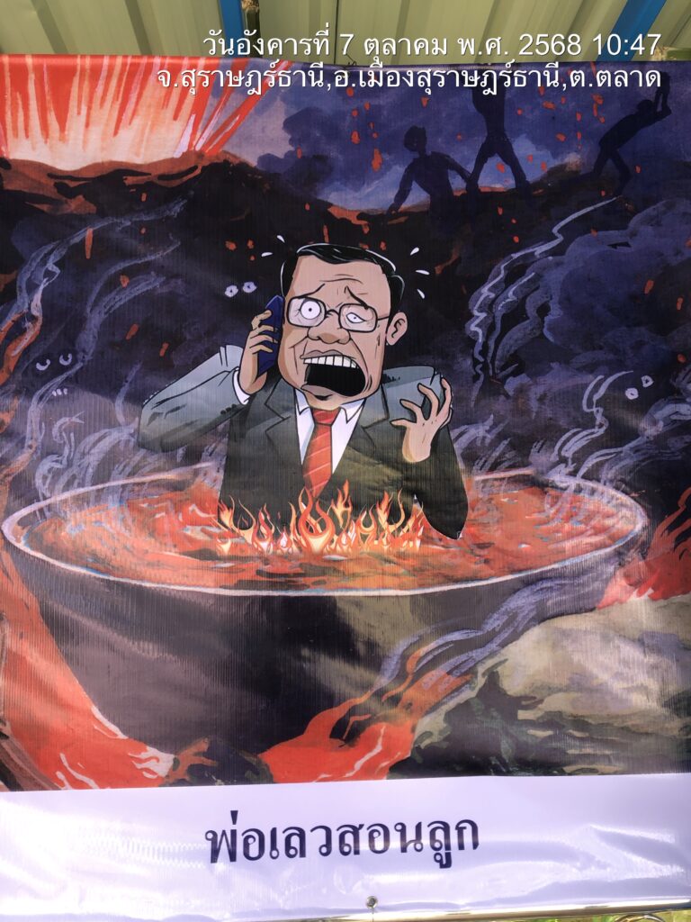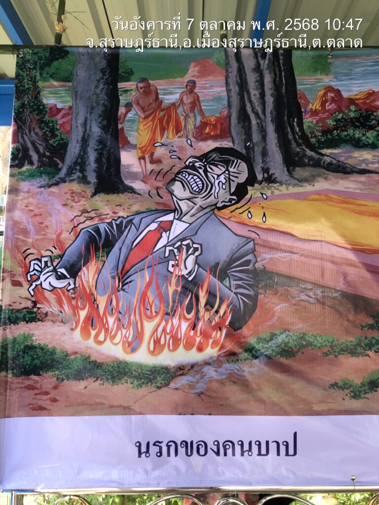 ส่วนภาคนรก เป็นภาพการ์ตูนล้อเลียนบุคคลที่มีใบหน้า“คล้ายสมเด็จฮุนเซน ”กำลังถูก“ธรณีสูบ” มีข้อความข้างล่างว่า “นรกของคนบาป”และภาพฮุนเซนใส่สูที่ “ตกนรกกระทะทองแดง” ในมือยังถือโทรศัพท์มือถือ ด้านล่างเขียนข้อความว่า“พ่อเลวสอนลูก”สะท้อนภาพกฎแห่งกรรมจากสงครามไทย-เขมรที่ฮุนเซ็นเป็นผู้ก่อไฟสงครามว่าเมื่อตายไปต้องตกนรกตามความเชื่อของชาวพุทธ เมื่อประชาชนได้เห็นภาพ“ฮุนเซ็นตกนรก”ก็เป็นที่ฮือฮาอย่างมากในงานชักพระสุราษฎร์ธานีประจำปีนี้.