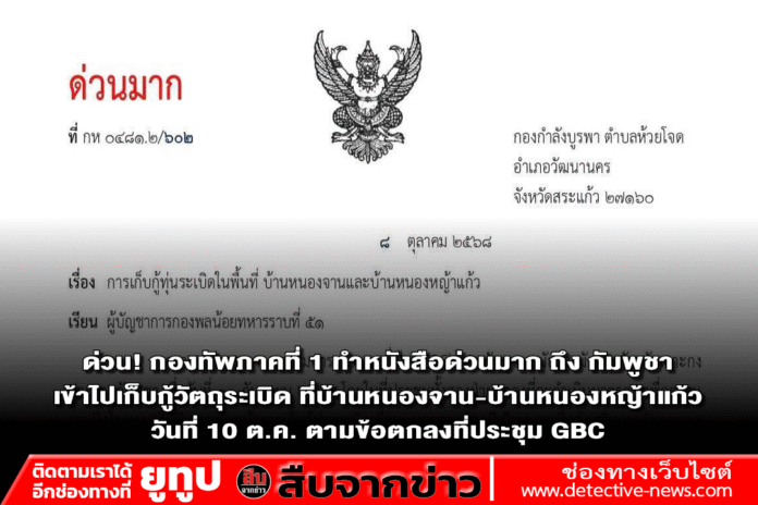 ด่วน! กองทัพภาคที่ 1 ทำหนังสือด่วนมาก ถึง กัมพูชา เข้าไปเก็บกู้วัตถุระเบิด ที่บ้านหนองจาน-บ้านหนองหญ้าแก้ว วันที่ 10 ต.ค. ตามข้อตกลงที่ประชุม GBC ความร่วมมือเก็บกู้วัตถุระเบิด แจ้งเพื่อป้องกันการเข้าใจผิด