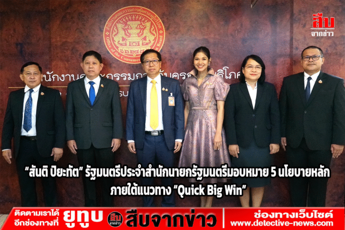 สคบ. วันนี้ ( 9 ต.ค.) นายสันติ ปิยะทัต รัฐมนตรีประจำสำนักนายกรัฐมนตรี เดินทางไปยังสำนักงานคณะกรรมการคุ้มครองผู้บริโภค (สคบ.) เพื่อพบปะข้าราชการ พนักงานราชการ และบุคลากรของ สคบ. ที่มีนายรณรงค์ พูลพิพัฒน์ เลขาธิการ สคบ. ให้การต้อนรับ พร้อมนำเยี่ยมชมการปฏิบัติงานของเจ้าหน้าที่ในการให้บริการประชาชน และนายสันติ ได้เป็นประธานการประชุมมอบนโยบายการขับเคลื่อนงานคุ้มครองผู้บริโภค ที่รัฐบาลได้ปักหมุด 5 ด้าน นโยบายสำคัญ ไม่ว่าจะเป็นด้านเศรษฐกิจ ด้านความมั่นคง ด้านสังคม ด้านสิ่งแวดล้อม และ รัฐทันสมัย มุ่งมั่นแก้ปัญหาของประเทศ เพื่อสนองนโยบายของรัฐ สำนักงานคณะกรรมการผู้บริโภค ในฐานะองค์กรที่เป็นกลไกสำคัญในการผลักดันแก้ไขปัญหาในด้านต่างๆ สคบ.เป็นหนึ่งในหน่วยงานที่รัฐบาลมอบหมายในการผลักดันมาตรการคุ้มครองผู้บริโภคเชิงรุก โดยมุ่งเน้นการบูรณาการแก้ไขปัญหาร่วมกับหน่วยงานที่เกี่ยวข้อง และการเพิ่มประสิทธิภาพของระบบรับเรื่องร้องเรียน เพื่อผลักดันภารกิจให้เกิดผลเป็นรูปธรรมผ่าน 5 นโยบายสำคัญ ภายใต้แนวทาง “Quick Big Win” ดังนี้