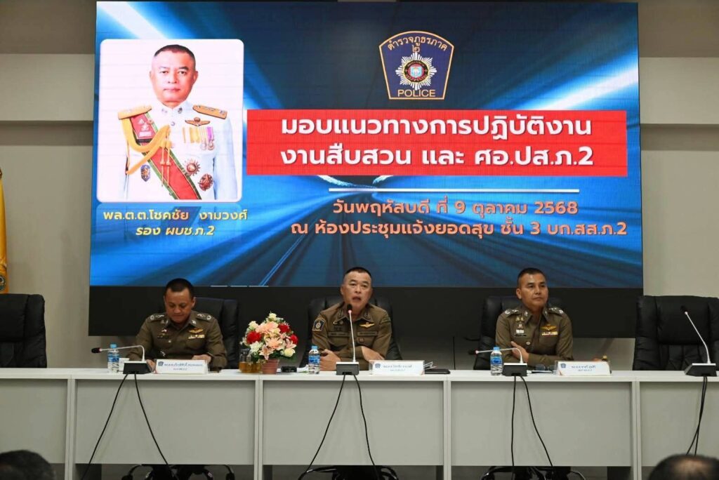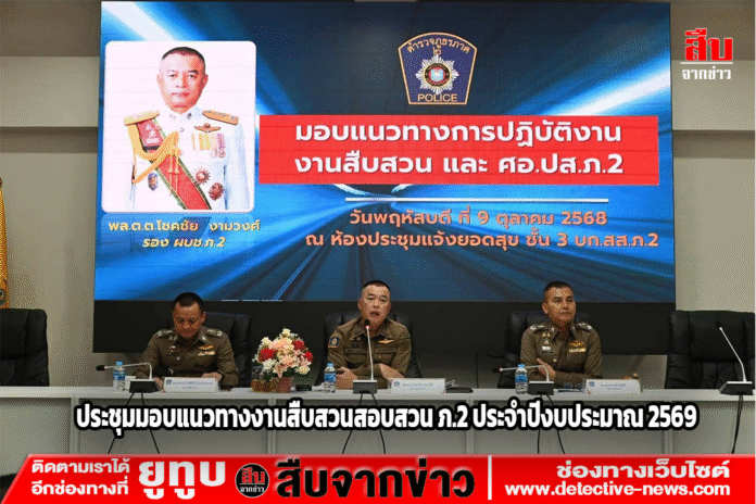 วันที่ 9 ตุลาคม 2568 เวลา 10.30 น. พล.ต.ต.โชคชัย งามวงศ์ รองผู้บัญชาการตำรวจภูธรภาค 2 (ด้านสืบสวนสอบสวน) เป็นประธานประชุมมอบแนวทางการปฏิบัติงานด้านสืบสวนสอบสวน ตำรวจภูธรภาค 2 ประจำปีงบประมาณ พ.ศ.2569 ณ ห้องประชุม “แจ้งยอดสุข” ชั้น 3 กองบังคับการสืบสวนสอบสวน ภ.2
