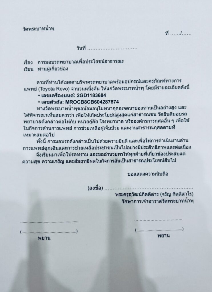 เมื่อ วันที่ 11 ต.ค.68 น.ส.แหม่ม (สงวนชื่อ/นามสกุล) อายุ 40 ปี พร้อมด้วยคณะกัลยาณมิตร ได้เปิดเผยต่อสื่อมวลชนถึงปัญหาความไม่สบายใจเกี่ยวกับการบริจาครถพยาบาลพร้อมอุปกรณ์และครุภัณฑ์ทางการแพทย์ (โตโยต้า วีโว่) มูลค่า 1,070,000 บาท ให้แก่วัดพระบาทน้ำพุ เมื่อปี 2565 โดยมีวัตถุประสงค์เพื่อให้วัดนำไปใช้ช่วยเหลือผู้ป่วยวิกฤติฉุกเฉิน