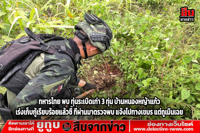 รายงานข่าว เปิดเผยว่า เราตรวจพบในพื้นที่บ้านหนองหญ้าแก้ว ซึ่งเราได้แจ้งกัมพูชาไปแล้ว และมีทุ่นระเบิดอยู่จริง แต่ที่ผ่านมาไม่ได้รับความร่วมมือจากฝ่ายกัมพูชา โดยมีการประท้วงตามกลไก ทำให้เราไม่สามารถเข้าตรวจสอบในขณะนั้นได้ จนเมื่อปัจจุบัน เข้าตรวจสอบก็พบว่ามีทุ่นระเบิดอยู่จริง และเพื่อความปลอดภัยของพี่น้องประชาชนและสื่อมวลชนจึงขอความกรุณา ไม่ให้เข้าพื้นที่ดังกล่าว