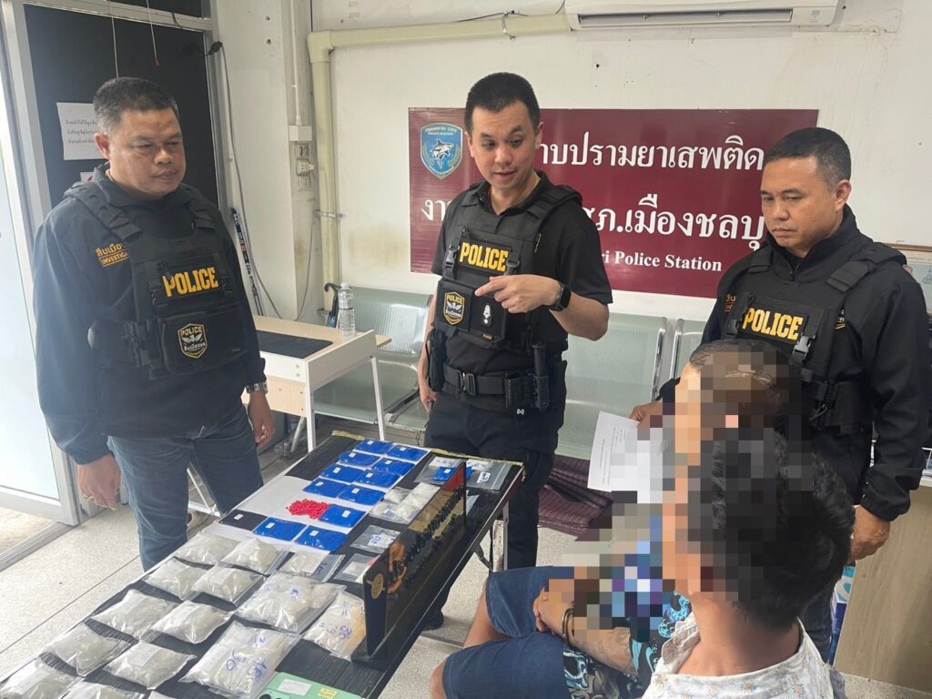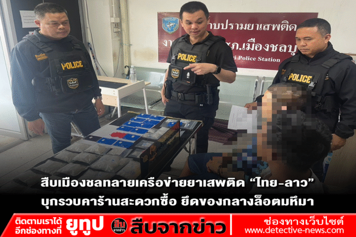 ปฏิบัติการฟ้าผ่า! ชุดสืบสวน สภ.เมืองชลบุรี วางแผนล่อซื้อยาเสพติด ก่อนบุกชาร์จรวบเอเย่นต์เครือข่าย “ไทย-ลาว” 2 ราย ขณะส่งมอบของกลางหน้าร้านสะดวกซื้อชื่อดัง ตะลึงค้นรถจักรยานยนต์เจอยาบ้า-ไอซ์-คีตามีน ซุกซ่อนล็อตใหญ่มูลค่ามหาศาล