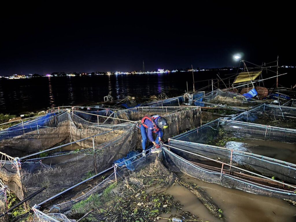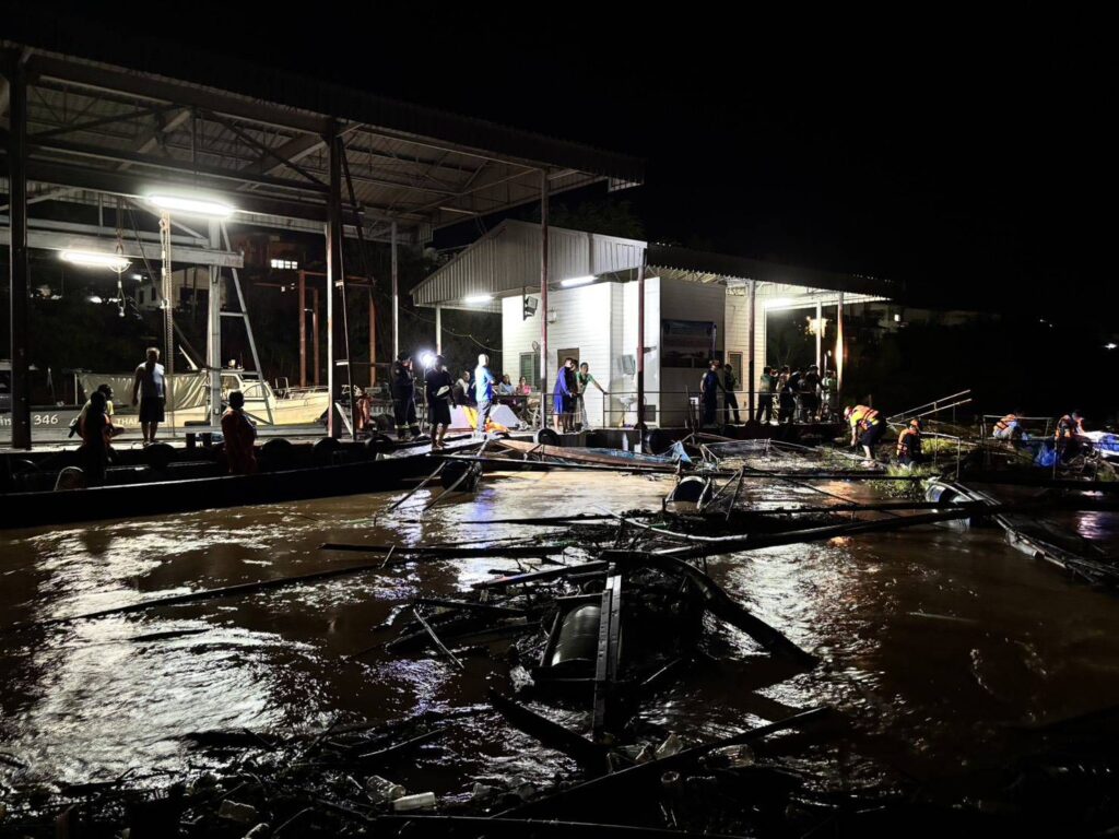 จากการตรวจสอบพบว่า แพกระชังปลาขนาด 60 หลุม ลอยมาตามน้ำโขง เจ้าหน้าที่พยายามผลักออกแต่ด้วยกระแสน้ำเชี่ยวและขนาดแพที่ใหญ่ ทำให้ติดค้างบริเวณแพเรือตรวจการณ์ โครงสร้างบางส่วนชนติดกับตัวแพ