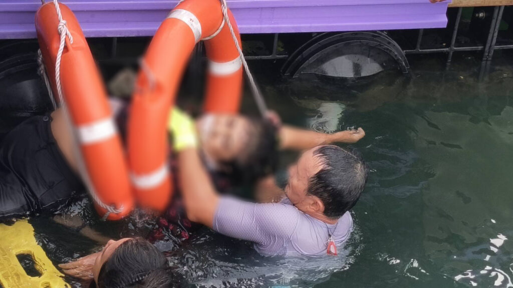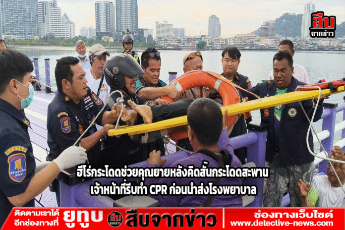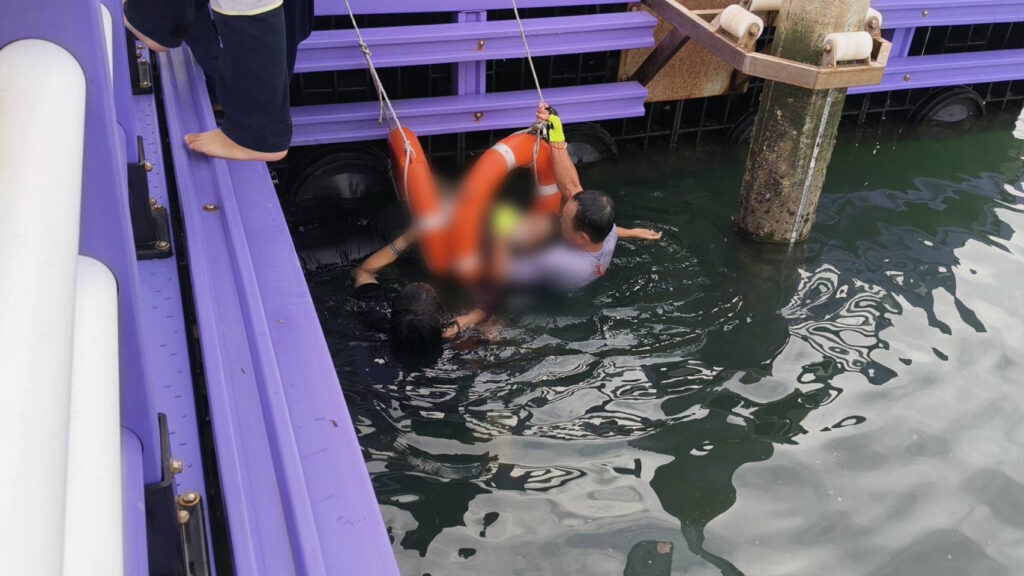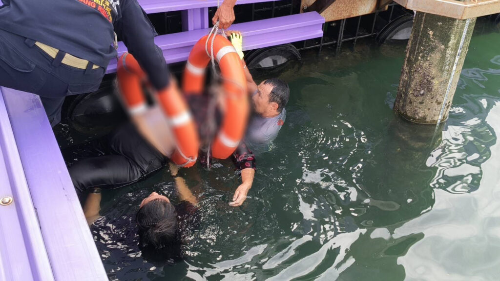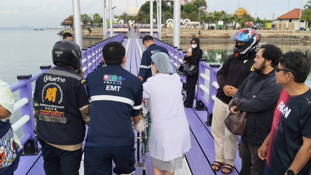 และที่เกิดเหตุเป็นสะพานลอยน้ำพบประชาชนและเจ้าหน้าที่กำลังช่วยหญิง สูงวัย ใส่กางเกงขายาวสีดำเสื้อแขนสั้นสีดำแดงโดยเจ้าหน้าที่และพลเมืองดีใช้ห่วงยางที่ทางสะพานม่วงจัดเตรียมไว้ให้สำหรับเกิดเหตุการณ์ไม่คาดคิดเกิดขึ้นโดยเจ้าหน้าที่และฮีโร่ได้ลงไปใน น้ำ เพื่อช่วยเหลือ บุคคลจมน้ำ และนำมา CPR บนสะพานก่อนนำส่งโรงพยาบาล โดยจัดการตรวจสอบไม่พบทรัพย์สิน พบเพียงรองเท้า 1 คู่และร่ม 1 อัน ในที่เกิดเหตุ