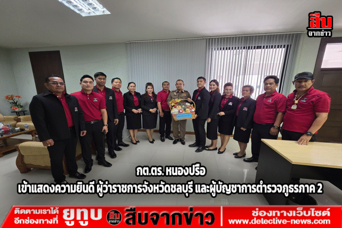 นายนพปฎล กองวิสัยสุข ประธานกรรมการตรวจสอบและติดตามการบริหารงานตำรวจ (กต.ตร.) สถานีตำรวจภูธรหนองปรือ จังหวัดชลบุรี นำคณะกรรมการ กต.ตร. หนองปรือ เดินทางเข้าคารวะและแสดงความยินดีแก่ นายนริศ นิรามัยวงศ์ ผู้ว่าราชการจังหวัดชลบุรี และ พล.ต.ท.ฉัตรชัย สุรเชษฐพงษ์ ผู้บัญชาการตำรวจภูธรภาค 2 พร้อมพบปะ พล.ต.ต.พงศ์พันธ์ วงษ์มณีเทศ ผู้บังคับการตำรวจภูธรจังหวัดชลบุรี