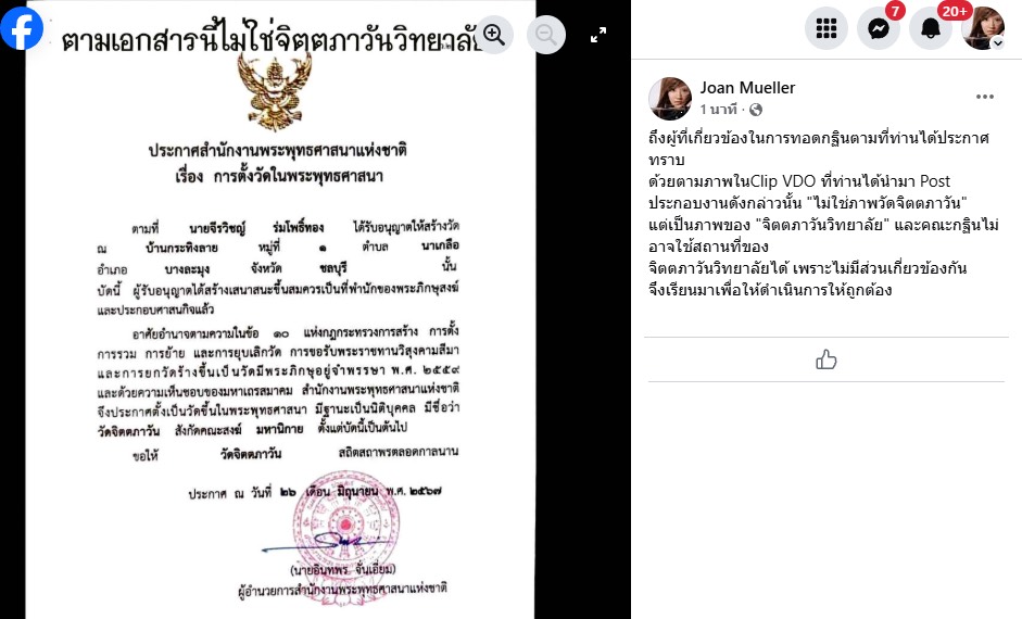 น.ส.อณัญญา ระบุว่า ระหว่างปี 2567 ถึงปัจจุบัน บุคคลทั้ง 7 ราย ได้ร่วมกันนำโฉนด 17 ไร่เศษ พร้อมภาพถ่ายในพื้นที่ของที่ดินแปลงอื่น ซึ่งไม่ใช่ในจิตตภาวันวิทยาลัย ไปประกอบการขอตั้งวัด อันเป็นการแจ้งข้อความอันเป็นเท็จต่อสำนักงานพระพุทธศาสนา เพื่อขอจดแจ้งให้สถานที่ดังกล่าวเป็นวัดในชื่อ “วัดจิตตภาวัน” โดยอ้างว่าการกระทำดังกล่าวเป็นการละเมิดพระราชอำนาจและขัดต่อพระราชกระแสรับสั่ง