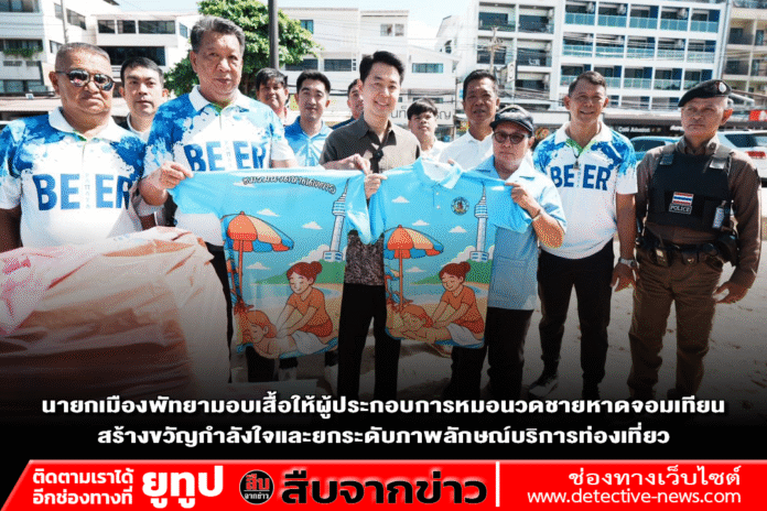 วันที่ 16 ตุลาคม 2568 นายปรเมศวร์ งามพิเชษฐ์ นายกเมืองพัทยา มอบเสื้อให้แก่ผู้ประกอบการหมอนวดชายหาดจอมเทียน โดยมี นายปรีชา ค้าขาย ที่ปรึกษานายกเมืองพัทยา นายไพรวัลย์ อารมณ์ชื่น รองประธานสภาเมืองพัทยา พร้อมด้วยสมาชิกสภาเมืองพัทยา สมาชิกสภาองค์การบริหารส่วนจังหวัดชลบุรี และผู้ช่วยเลขานุการประธานสภาเมืองพัทยา ร่วมในพิธีมอบเสื้อ ณ บริเวณชายหาดจอมเทียน เมืองพัทยา