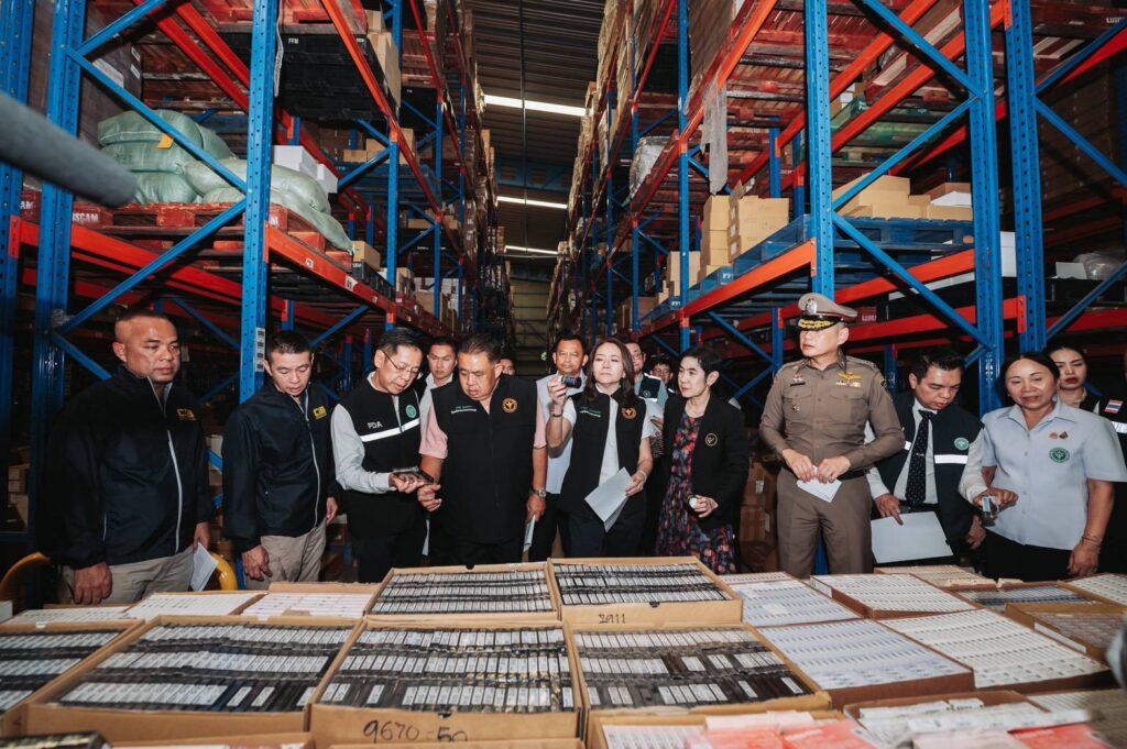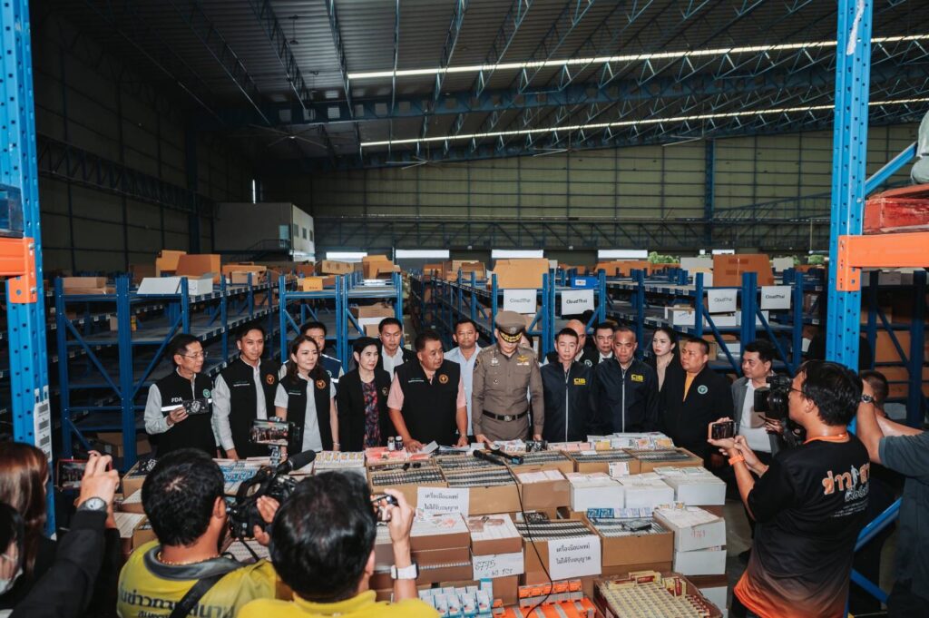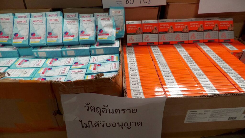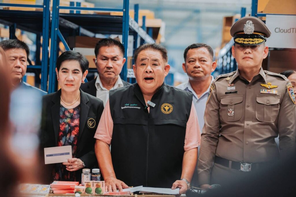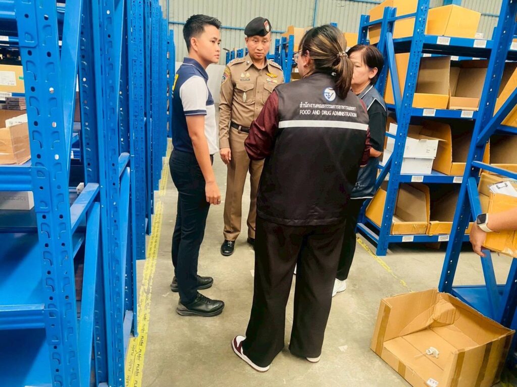 ต่อมาเมื่อวันที่ 16 ตุลาคม 2568 เจ้าหน้าที่ตำรวจ กก.4 บก.ปคบ. ร่วมกับ อย. ได้นำหมายศาลจังหวัดสมุทรปราการ เข้าตรวจค้นโกดังจัดเก็บและกระจายสินค้าแห่งหนึ่งในพื้นที่ ต.บางเสาธง อ.บางเสาธง จ.สมุทรปราการ ซึ่งเปิดดำเนินการในลักษณะ “เก็บ แพ็ค ส่ง” (Fulfillment) โดยมีนายทุนชาวจีนเป็นผู้สั่งสินค้าจากประเทศจีนเข้ามาจัดเก็บและรอแพ็คส่งให้กับลูกค้าชาวไทย ผลการตรวจค้นสามารถ ตรวจยึดและอายัดของกลางได้รวมทั้งสิ้น 385,070 ชิ้น มูลค่ากว่า 17,873,500 บาท
