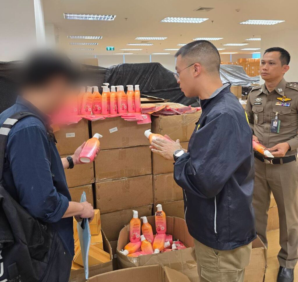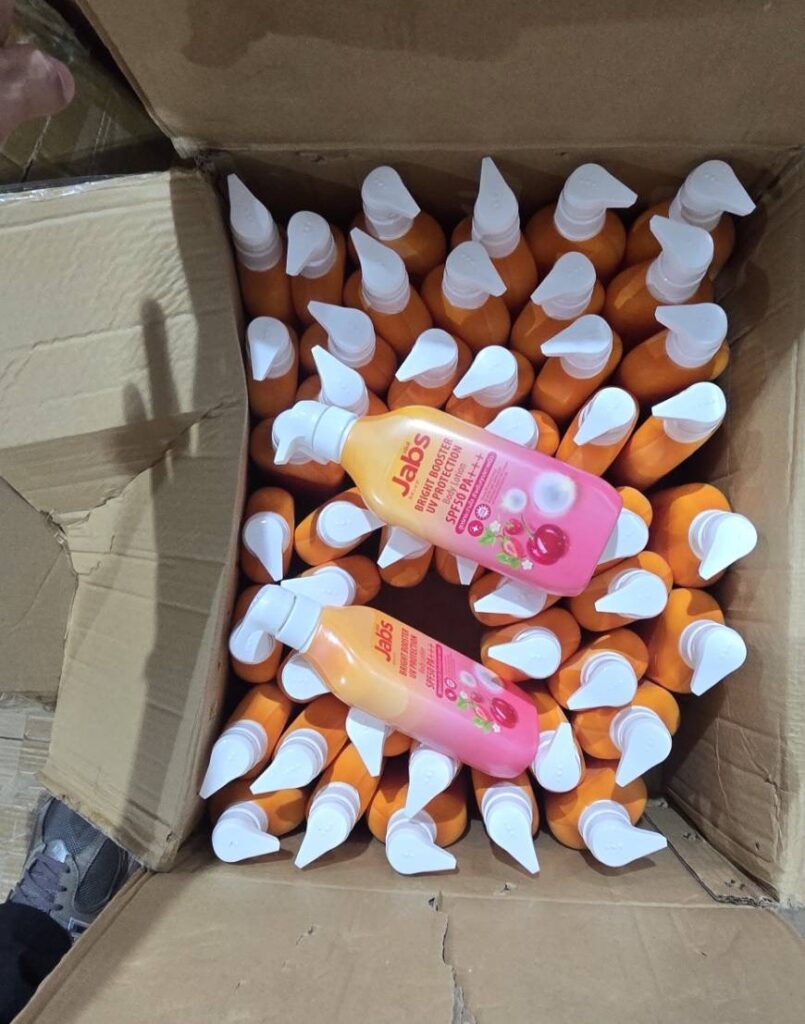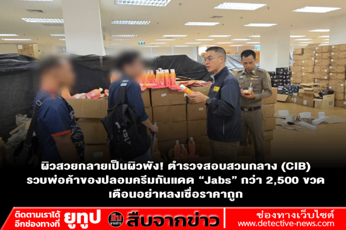 พร้อมตรวจยึดของกลาง โลชั่นกันแดดปลอมเครื่องหมายการค้า ยี่ห้อ “JABS” จำนวนกว่า 2,500 ขวด