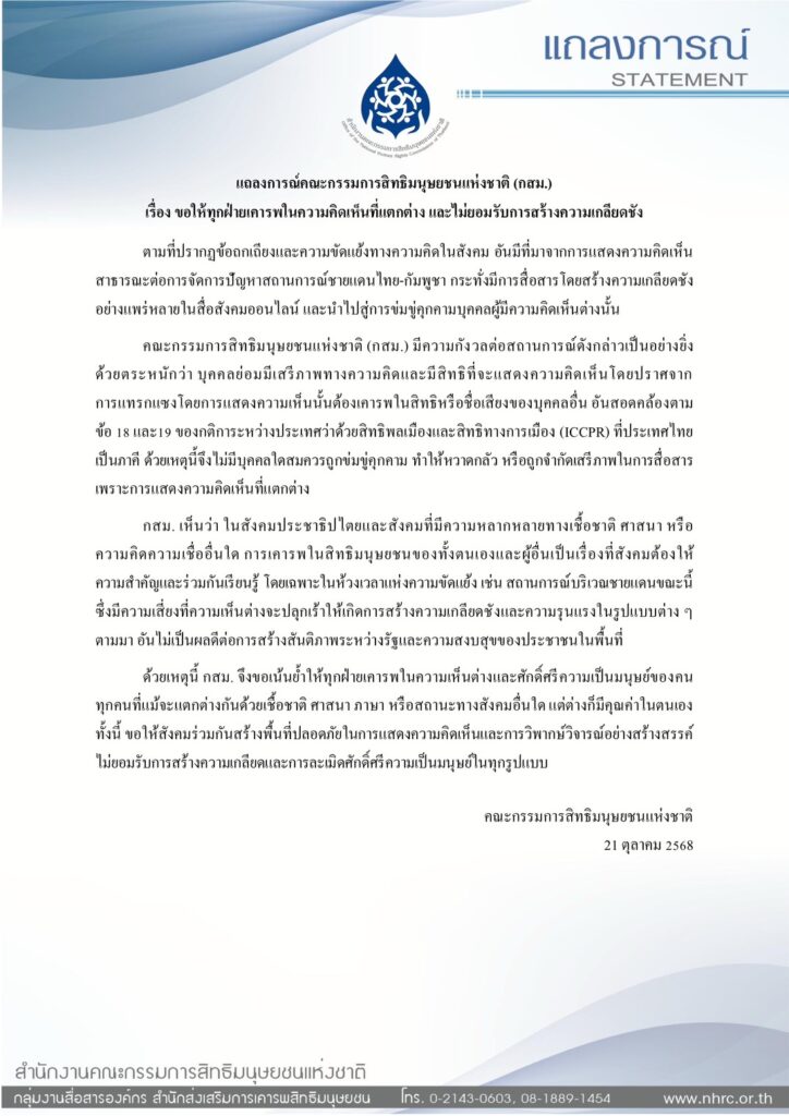 กสม. เห็นว่า ในสังคมประชาธิปไตยและสังคมที่มีความหลากหลายทางเชื้อชาติ ศาสนา หรือความคิดความเชื่ออื่นใด การเคารพในสิทธิมนุษยชนของทั้งตนเองและผู้อื่นเป็นเรื่องที่สังคมต้องให้ความสำคัญและร่วมกันเรียนรู้ โดยเฉพาะในห้วงเวลาแห่งความขัดแย้ง เช่น สถานการณ์บริเวณชายแดนขณะนี้ ซึ่งมีความเสี่ยงที่ความเห็นต่างจะปลุกเร้าให้เกิดการสร้างความเกลียดชังและความรุนแรงในรูปแบบต่าง ๆ ตามมา อันไม่เป็นผลดีต่อการสร้างสันติภาพระหว่างรัฐและความสงบสุขของประชาชนในพื้นที่