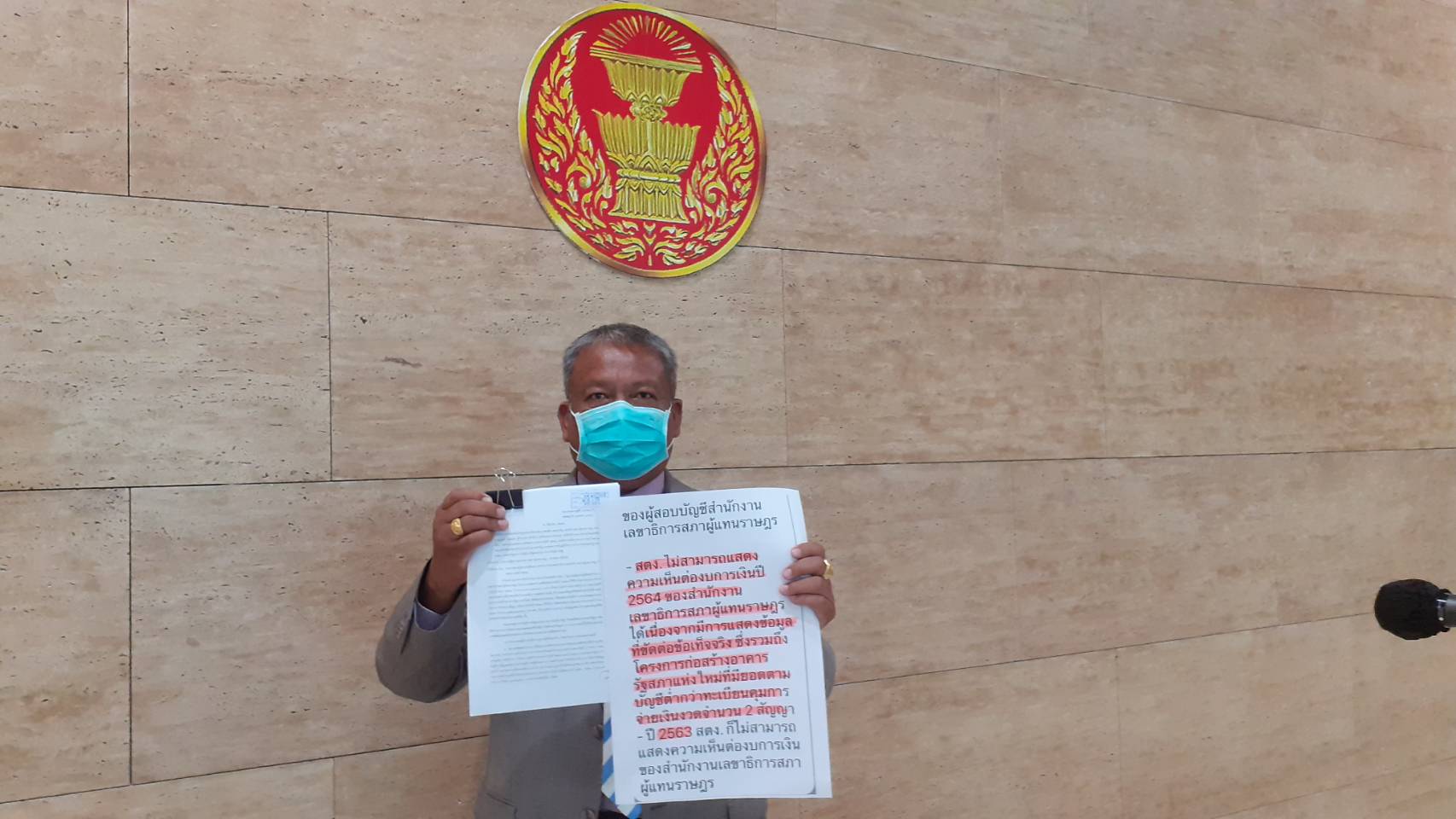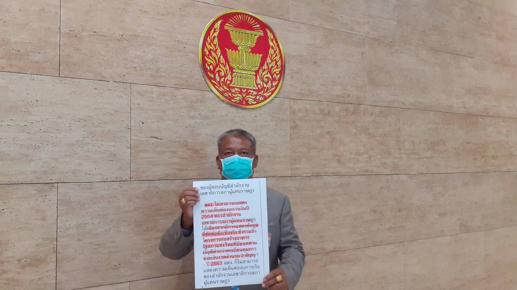 นายวัชระ ได้ระบุในหนังสือร้องเรียนว่า ด้วยปรากฏรายงานสำนักงานการตรวจเงินแผ่นดิน (สตง.) ในฐานะผู้สอบบัญชีของสำนักงานเลขาธิการสภาผู้แทนราษฎร ไม่สามารถแสดงความเห็นต่องบการเงินปี 2564 ที่ได้รับเงินงบประมาณรายจ่ายประจำปีจำนวน 2,876,534,800 บาท เนื่องจากไม่สามารถหาหลักฐานการสอบบัญชีที่เหมาะสมอย่างเพียงพอเพื่อเป็นเกณฑ์ในการแสดงความเห็น มีการแสดงข้อมูลที่ขัดต่อข้อเท็จจริงซึ่งรวมถึงโครงการก่อสร้างอาคารรัฐสภาแห่งใหม่พร้อมอาคารประกอบที่มียอดตามบัญชีต่ำกว่าทะเบียนคุมการจ่ายเงินงวด จำนวน 2 สัญญา และงบการเงินปี 2563 ที่ได้รับการจัดสรรเงินงบประมาณรายจ่ายประจำปีจำนวน 2,758,288,200 บาท ซึ่งสตง. มีความเห็นว่ารายงานการเงินไม่ถูกต้อง มีการแสดงข้อมูลที่ขัดต่อข้อเท็จจริงอันเป็นสาระสำคัญนั้น ตามมาตรฐานการบัญชีภาครัฐและนโยบายการบัญชีภาครัฐ กำหนดให้หน่วยงานของรัฐสภาต้องจัดทำรายงานการเงินอย่างสมเหตุสมผล เพื่อให้ผู้จำเป็นต้องนำข้อมูลจากรายงานการเงินนี้ไปใช้ประโยชน์ในการตัดสินใจและใช้ประเมินความรับผิดชอบของหน่วยงานที่มีต่อสาธารณะ ดังนั้น จึงมีข้อสงสัยหลายประการที่ต้องสอบถามคือ