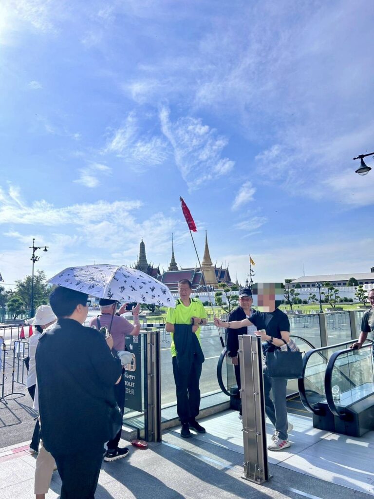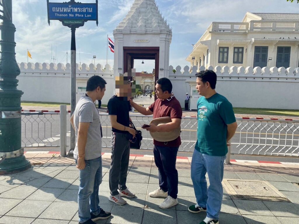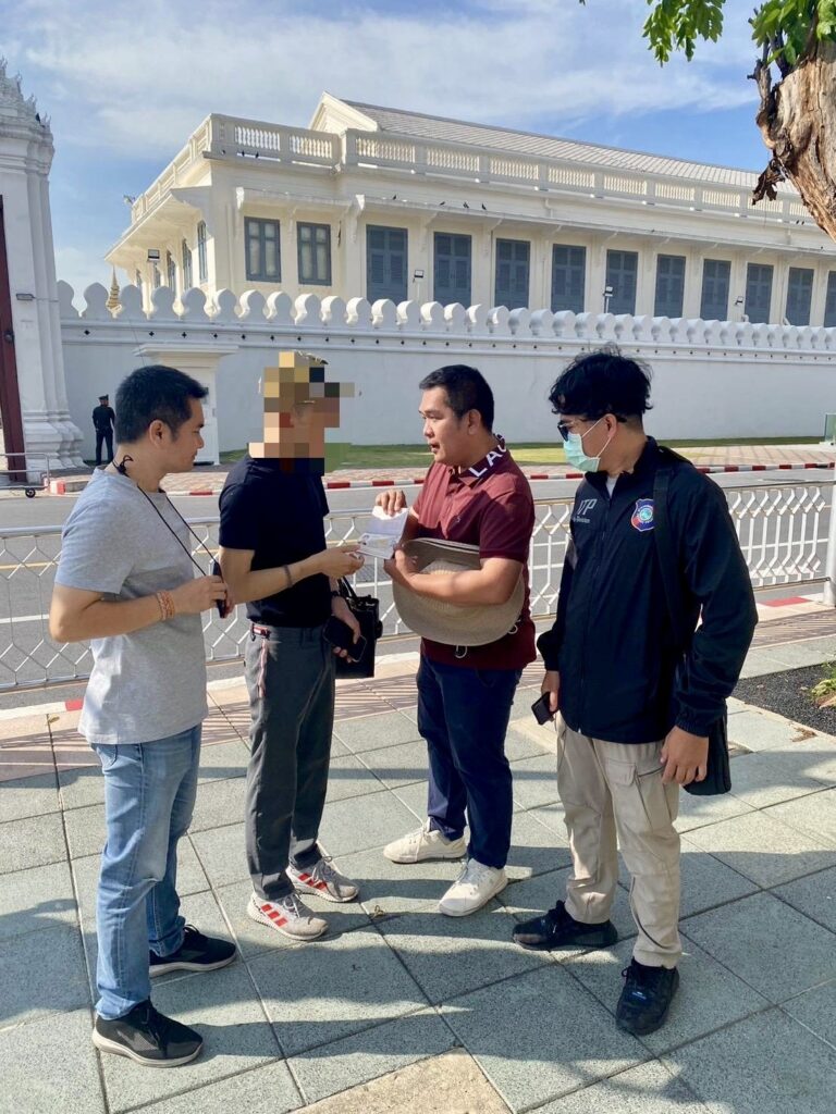 ตลอดระยะทาง ชุดสืบสวนได้เฝ้าติดตามพฤติกรรมอย่างใกล้ชิด พบว่าชายชาวจีนดังกล่าว ได้ถือไมค์ในลักษณะบรรยายให้ความรู้แก่นักท่องเที่ยว เมื่อรถมาถึงจุดรับส่งนักท่องเที่ยว หน้าวัดพระแก้วฯ บุคคลดังกล่าวได้ถือธงนำนักท่องเที่ยวเดินเข้าเที่ยวชมวัดพระแก้วผ่านอุโมงค์ประตู 2 เข้าประตูมณีนพรัตน์ เมื่อส่งนักท่องเที่ยวเข้าวัดพระแก้วแล้ว จึงได้ออกมายืนรอที่บริเวณหน้าประตูวิเศษไชยศรี ชุดจับกุมจึงแสดงตัวเข้าตรวจสอบและแจ้งข้อกล่าวหาบริเวณดังกล่าว