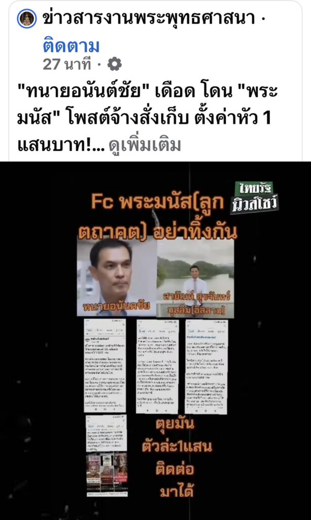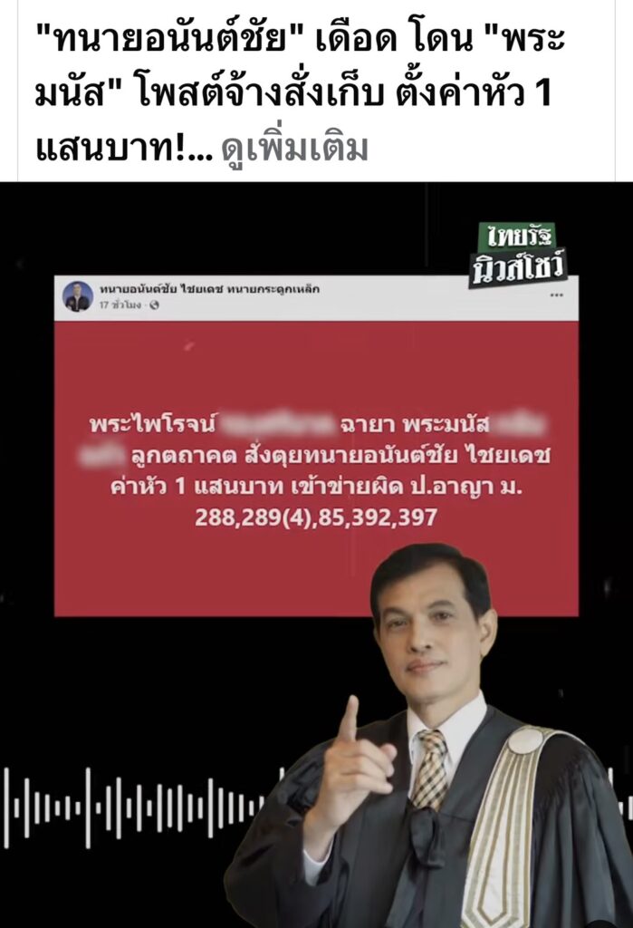 วันที่ 23 ตุลาคม 2568 นายอนันต์ชัย ไชยเดช ประธานมูลนิธิทนายกองทัพธรรม เตรียมเดินหน้าดำเนินคดีครั้งใหญ่ หลังถูกผู้ใช้เฟซบุ๊กชื่อ “พระมนัส ลูกตถาคต ส่งเสริมความเป็นไทย” ซึ่งระบุตัวตนว่าเป็น “พระมนัส” หรือ “พระไพโรจน์” โพสต์ข้อความและคลิปวิดีโอในลักษณะ จ้างวานฆ่า ตนเองและนายสายัณห์ โดยเสนอค่าหัวคนละ 100,000 บาท