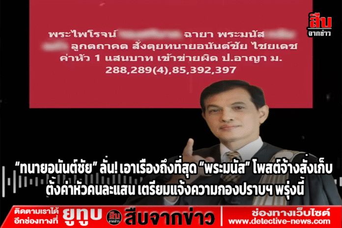 “ทนายอนันต์ชัย ไชยเดช” เดินหน้าดำเนินคดีครั้งใหญ่ หลังถูก “พระมนัส ลูกตถาคต” โพสต์จ้างวานฆ่าผ่านเฟซบุ๊ก ตั้งค่าหัวตนเองและ “นายสายัณห์” คนละ 1 แสนบาท เตรียมเข้าแจ้งความกองปราบฯ พรุ่งนี้ พร้อมแถลงความคืบหน้าคดี “เชื่อมจิต” และคดีอื่นที่เกี่ยวข้อง