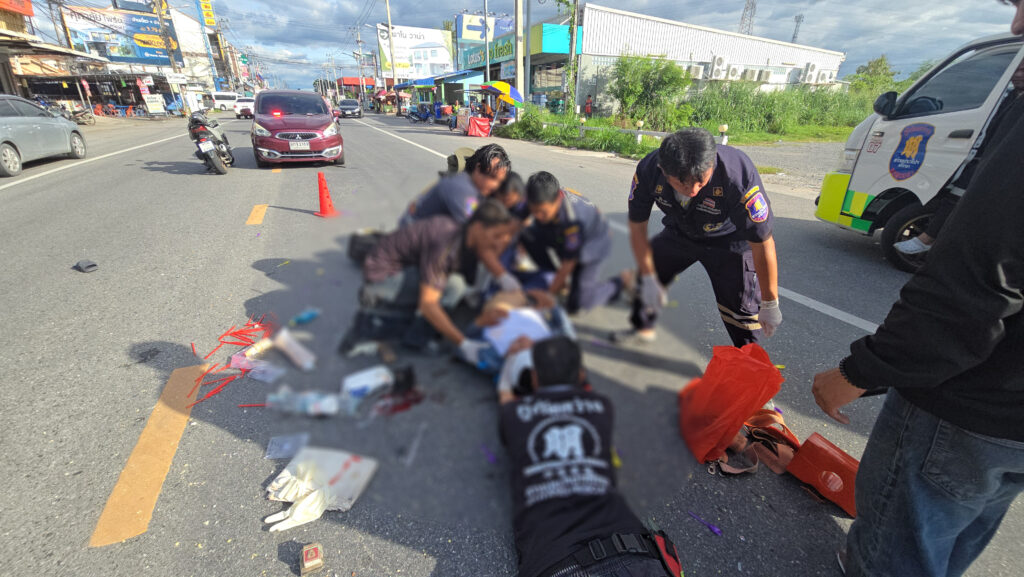 ห่างออกไปกลางถนน พบรถจักรยานยนต์พ่วงข้างขายไอศกรีม ยี่ห้อ ฮอนด้า เวฟ สีน้ำเงิน ทะเบียน 3 กง 2571 ชลบุรี ด้านหน้าทิ่มพื้น ส่วนท้ายชี้ฟ้า อุปกรณ์ขายไอศกรีมกระเด็นเกลื่อนถนน โดยมีชายชาวเมียนมา อายุประมาณ 45–55 ปี นอนบาดเจ็บสาหัสกลางถนน เจ้าหน้าที่เร่งช่วยเหลือก่อนนำส่งโรงพยาบาลเป็นการด่วน