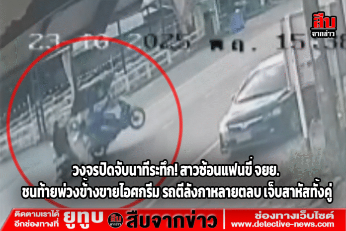 กล้องวงจรปิดเผยเหตุสุดระทึก! สาววัย 22 ปีขี่รถจักรยานยนต์ซ้อนแฟนหนุ่มที่ป่วยไปโรงพยาบาล ชนท้ายรถพ่วงข้างขายไอศกรีมกลางถนนศรีราชา แรงปะทะทำรถตีลังกาหลายตลบ บาดเจ็บสาหัสทั้งสองฝ่าย