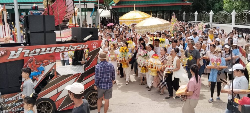 สำหรับขบวนแห่กฐินสามัคคีเป็นไปอย่างยิ่งใหญ่ โดยมีพุ่มกฐินมาร่วมแห่กว่า 100 พุ่ม และผ้าไตรบริวารกฐินกว่า 500 ผืน ขบวนแห่มีความยาวกว่า 1.5 กิโลเมตร สะท้อนถึงพลังศรัทธาของประชาชน เบื้องต้นมียอดเงินสมทบถวายวัดรวมกว่า 2.2 ล้านบาท นอกจากนี้ยังมีผู้มีจิตศรัทธานำอาหาร เครื่องดื่ม และขนม มาจัดตั้งโรงทานบริการผู้ร่วมงานฟรีกว่า 300 โรงทาน