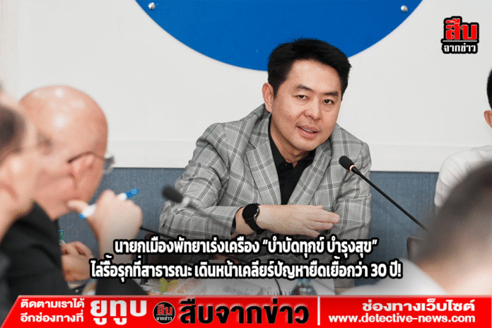 นายปรเมศวร์ งามพิเชษฐ์ นายกเมืองพัทยา ประชุมติดตามความคืบหน้าการขับเคลื่อนนโยบาย “บำบัดทุกข์ บำรุงสุข” เดินหน้าแก้ปัญหาพื้นที่สาธารณะถูกบุกรุก เร่งรื้อถอนกรณีค้างเก่ากว่า 30 ปี พร้อมกำชับทุกหน่วยเร่งผลักดันงานเพื่อประโยชน์ของประชาชนอย่างเป็นรูปธรรม