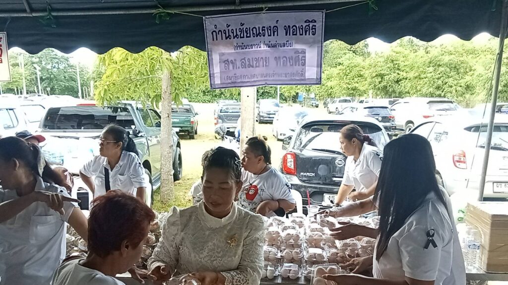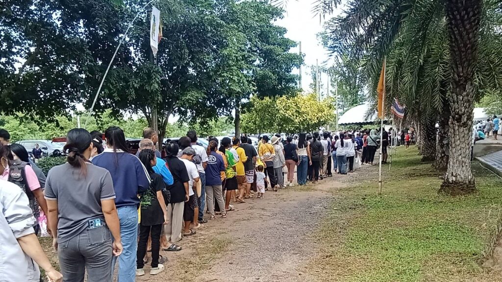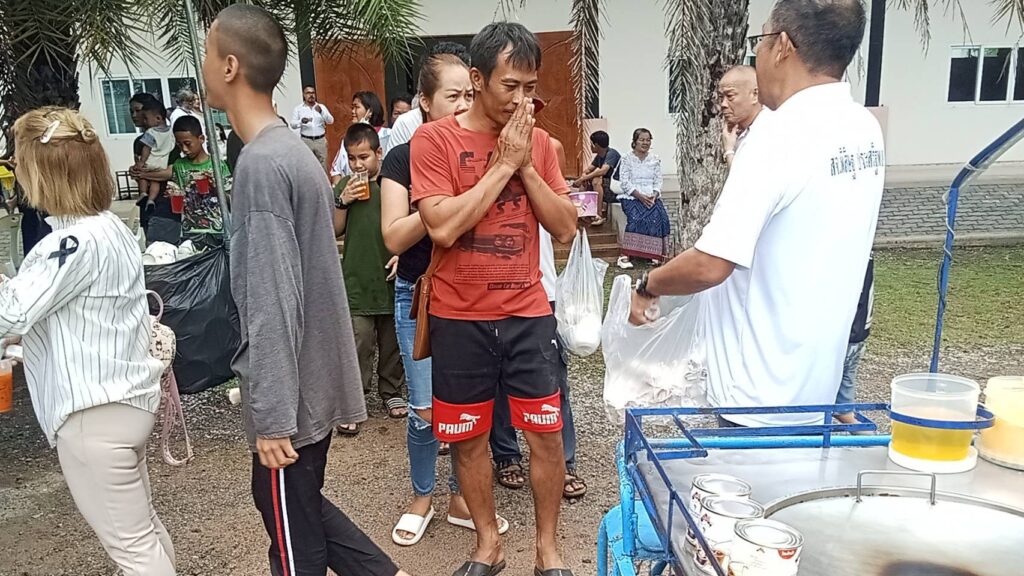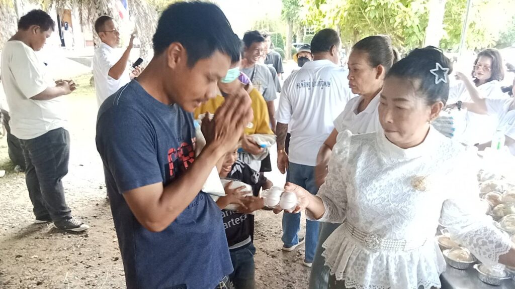 วันที่ 1 พฤศจิกายน 2568 เวลา 10.00 น. ที่อาคารสิริบูรพาธรรมสถาน หมู่ 4 ตำบลบึง อำเภอศรีราชา จังหวัดชลบุรี บรรยากาศเต็มไปด้วยความอบอุ่นและความคึกคัก เมื่อชาวบ้านหลายร้อยคน ทั้งคนไทยและแรงงานต่างด้าว มาต่อแถวรอรับสิ่งของยังชีพจากโรงทานที่จัดขึ้นเพื่อช่วยเหลือประชาชนในช่วงเศรษฐกิจย่ำแย่