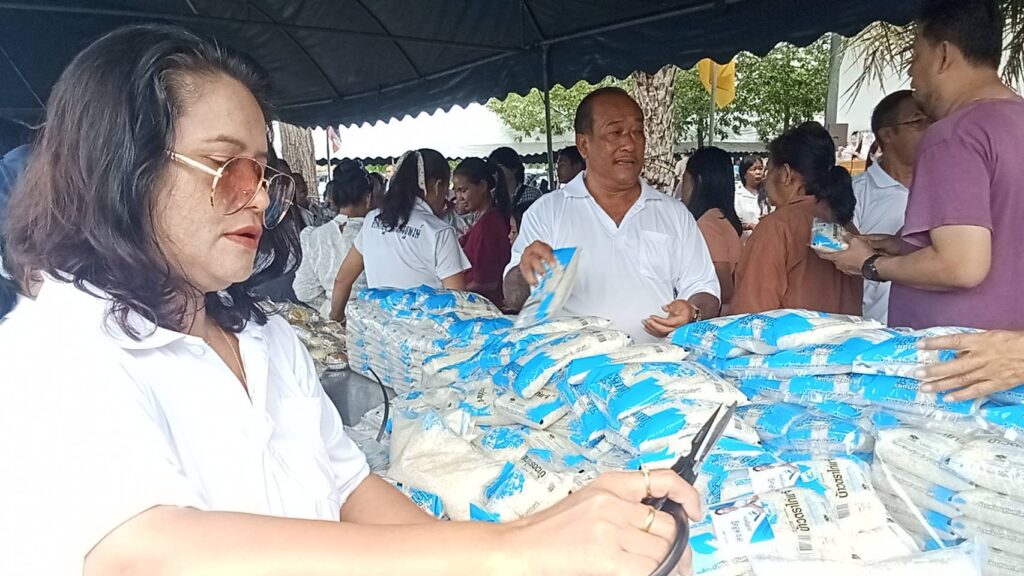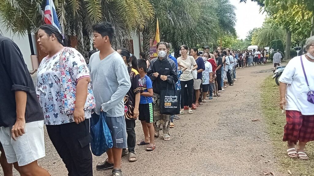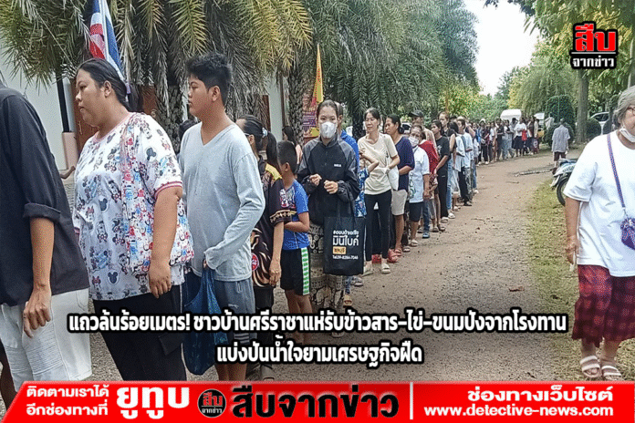 น้ำใจไม่เคยขาด! ชาวบ้านตำบลบึงหลายร้อยชีวิต ต่อคิวยาวร่วมร้อยเมตร รอรับข้าวสาร ไข่ไก่ ขนมปัง และโรตีจากโรงทานที่จัดโดยสมาชิก อบจ.ชลบุรี และกำนันตำบลบึง ใช้เวลาเพียงไม่ถึง 20 นาทีก็แจกหมดเกลี้ยง สะท้อนวิกฤตค่าครองชีพที่ถาโถม แต่ยังคงมีรอยยิ้มจากการแบ่งปัน
