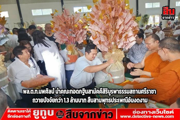 งดงามสมศรัทธา — พลตำรวจโท นพศิลป์ พูลสวัสดิ์ ผู้บัญชาการประจำสำนักงานตำรวจแห่งชาติ พร้อมครอบครัว เป็นเจ้าภาพฝ่ายฆราวาสทอดกฐินสามัคคี ณ สิริบูรพาธรรมสถาน ตำบลบึง อำเภอศรีราชา จังหวัดชลบุรี ถวายปัจจัยกว่า 1.3 ล้านบาท สมทบทุนบูรณปฏิสังขรณ์วัดและส่งเสริมพระพุทธศาสนา