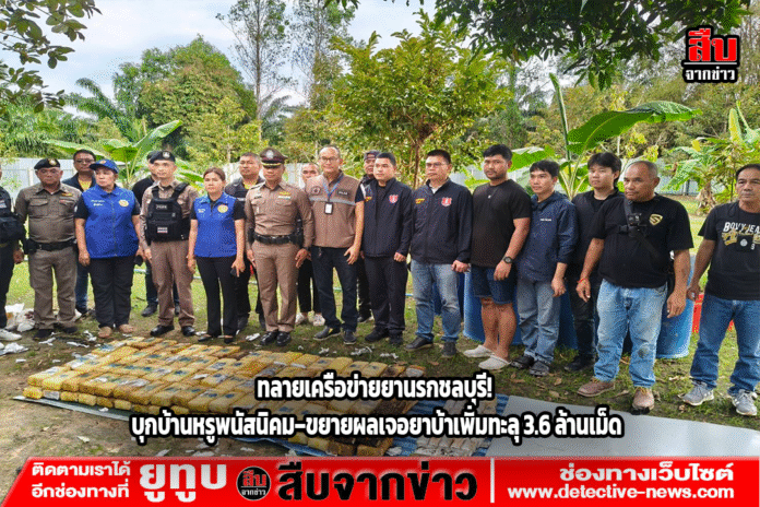 ระอุทั้งชลบุรี! ตำรวจ บช.ปส. ร่วม สภ.พนัสนิคม บุกทลายเครือข่ายค้ายาเสพติดรายใหญ่ ยึดยาบ้า–ไอซ์รวมกว่า 3.6 ล้านเม็ด ในบ้านทรงไทยหรู ก่อนขยายผลค้นบ้านไร่ในพื้นที่เกาะจันทร์ เจอยาอีก 1.52 ล้านเม็ด รวมมูลค่ากว่าพันล้านบาท ผู้ต้องหาถูกจับ 3 ราย คุมตัวดำเนินคดีหนักข้อหาค้ายาเพื่อการค้า
