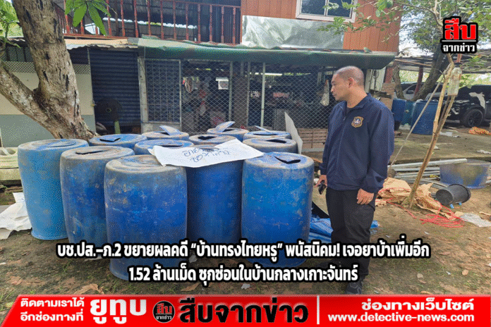 แรงไม่หยุด! ตำรวจ บช.ปส. ร่วมกับ ภ.2 และ สภ.พนัสนิคม ขยายผลคดียาเสพติด “บ้านทรงไทยหรู” ที่พนัสนิคม ลุยค้นต่อบ้านพื้นที่เกาะจันทร์ พบยาบ้าซุกซ่อนเพิ่มอีก กว่า 1.52 ล้านเม็ด ยืนยันเดินหน้ากวาดล้างเครือข่ายค้ายาเสพติดให้สิ้นซาก