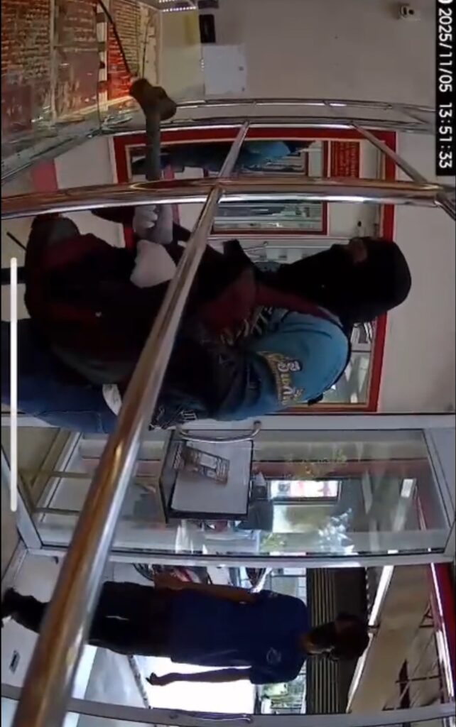 จากกล้องวงจรปิดพบว่า คนร้ายรายแรกสวมเสื้อสีน้ำเงิน ทำทีเข้ามาเลือกซื้อทอง ขณะที่รายที่สองสวมหมวกไหมพรมสีดำ บุกเข้าไปใช้ของแข็งทุบตู้กระจกใส่ทองคำ แต่ถูกเจ้าของร้านควักปืนออกมาข่มขู่ ทำให้ทั้งคู่ต้องรีบวิ่งหนีออกจากร้านไปอย่างรวดเร็ว