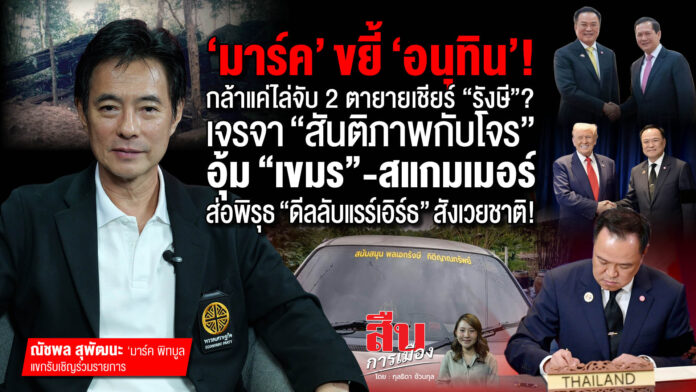 “…เสียงปืนชายแดนยังไม่สงบ มันตลกร้ายสิ้นดี! ในขณะที่ตำรวจ “ขยัน” ไล่ควบคุมตัว 2 ตายายเพียงเพราะสติกเกอร์การเมือง “สนับสนุน พลเอกรังสี” อ้าง “สร้างความวุ่นวาย” แต่ชายแดนกลับ “ลุกเป็นไฟ” เมื่อ “เขมร” ปักธงสร้างกระเช้ายุทธปัจจัยรุกคืบ “ปราสาทคณา” แต่รัฐบาลไทยกลับมีท่าที “อ่อนปวกเปียก” บินไปลงนาม “สันติภาพจอมปลอม” “สืบจากข่าว” ชวน “มาร์ค พิทบูล” ฉะแหลกปฏิบัติการพิลึก ที่ส่อกลิ่น “ดีลลับ” สังเวยทรัพยากรชาติ และการเกรงใจ “รัฐโจร” เป็นเดิมพัน!…”