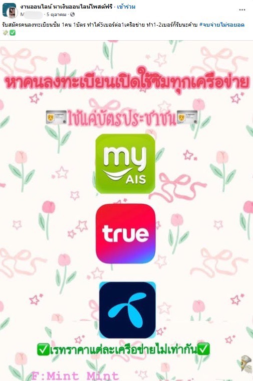 จากการสืบสวนพบว่า ผู้ต้องหาใช้เฟซบุ๊กชื่อ “Mint ฯ (เรียกเราว่า มายมิ้นท์)” เปิดโพสต์โฆษณาในกลุ่มเฟซบุ๊กสาธารณะ รับจ้างเปิดลงทะเบียนซิมการ์ดโทรศัพท์มือถือให้บุคคลอื่น โดยมีค่าตอบแทนเป็นรายหัว ลักษณะเป็น “นายหน้าซื้อขายซิมผี” — ซิมที่มีชื่อบุคคลลงทะเบียนไว้แต่ไม่สามารถระบุตัวผู้ใช้งานจริง ทำให้ยากต่อการติดตามตัวเมื่อเกิดอาชญากรรม
