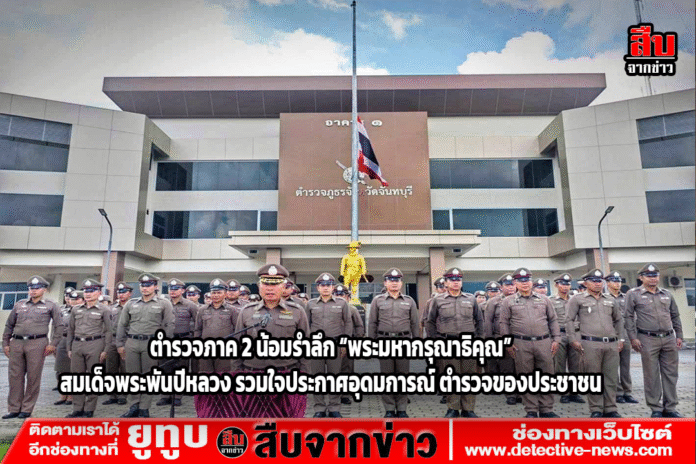 ข้าราชการตำรวจภูธรภาค 2 ร่วมยืนสงบนิ่งน้อมรำลึกในพระมหากรุณาธิคุณ สมเด็จพระนางเจ้าสิริกิติ์ พระบรมราชินีนาถ พระบรมราชชนนีพันปีหลวง พร้อมกล่าวคำปฏิญาณแสดงความจงรักภักดีและอุดมคติความเป็น “ตำรวจของประชาชน” อย่างพร้อมเพรียง