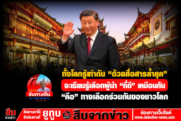 “….สังคมโลกประกอบด้วยประชากรร่วม 8000 ล้านคน จาก 200 ประเทศ เนื่องด้วยความก้าวหน้าของการสื่อสารและเทคโนโลยี่ล้ำยุควันนี้ ทำให้ความแตกต่างค่อยๆหายไป ชาวโลกโดยรวมได้รับรู้ในเรื่องเดียวกันในเวลาเดียวกันมากขึ้นเรื่อยๆ เร็วขึ้นเรื่อยๆ ทำให้ชาวโลกมองเห็นปัญหาไปในทำนองเดียวกัน เกิดความต้องการไปในทำนองเดียวกันมากขึ้นเรื่อยๆ ดังนั้น แนวโน้มที่การเลือกคณะผู้บริหารประเทศที่ถือเอาผลประโยชน์ของประชาชาชนเป็นตัวตั้ง จะกลายเป็นการเลือกสูงสุดร่วมกันของชาวโลก จึงเป็นไปได้สูงมาก นั่นคือ ประเทศที่มีคณะผู้บริหารที่ถือเอาประชาชนเป็นศูนย์กลาง ย่อมจะพัฒนาไปได้ดีกว่า เร็วกว่า อย่างแน่นอน เพราะอย่างน้อยที่สุดก็ตัดปัญหาการทุจริตโกงกินไปได้โดยพื้นฐาน อีกทั้งหากโชคดีได้คนดีมีฝีมือฉกาจขึ้นทำหน้าที่ ก็จะเพิ่มพูนโอกาสแห่งความสำเร็จได้มากขึ้นเป็นเท่าตัว ไม่ต้องดูอื่นไกล ประเทศจีนสามารถพัฒนาจนเจริญก้าวหน้าอย่างต่อเนื่อง ในอัตราที่เร็วยิ่งกว่าประเทศอื่นใด ก็ด้วยแรงสนับสนุนของประขาชนทั้งประเทศ ในสายตาของชาวจีนทั่วไป แผนพัฒนาประเทศก็คือแผนพัฒนาชีวิตความเป็นอยู่ของพวกเขาเอง ประเทศยิ่งเจริญ พวกเขาก็จะยิ่งสุขสบาย อีกไม่นานนักหรอก คนไทยก็จะเจาะจงเลือกเฉพาะคณะผู้บริหารประเทศที่ถือเอาประชาชนเป็นศูนย์กลางเท่านั้น โดยไม่แยแสต่อเงินซื้อเสียงแต่ประการใด…”