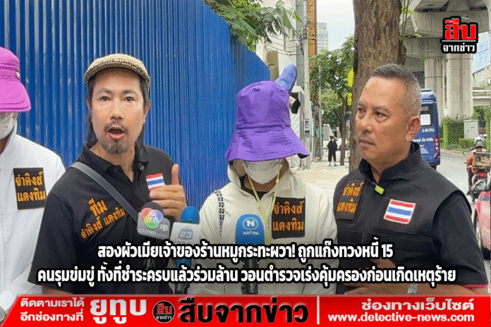 สองผัวเมียเจ้าของร้านหมูกระทะชื่อดังย่านปากเกร็ด โร่ร้อง “กองปราบ” หลังถูกแก๊งทวงหนี้นอกระบบกว่า 15 คน รุมข่มขู่–คุกคามรายวัน ทั้งที่ชำระหนี้ครบแล้วกว่า 1 ล้านบาท วอนตำรวจเร่งรัดคดีและคุ้มครองความปลอดภัย หวั่นเกิดอันตรายถึงชีวิต