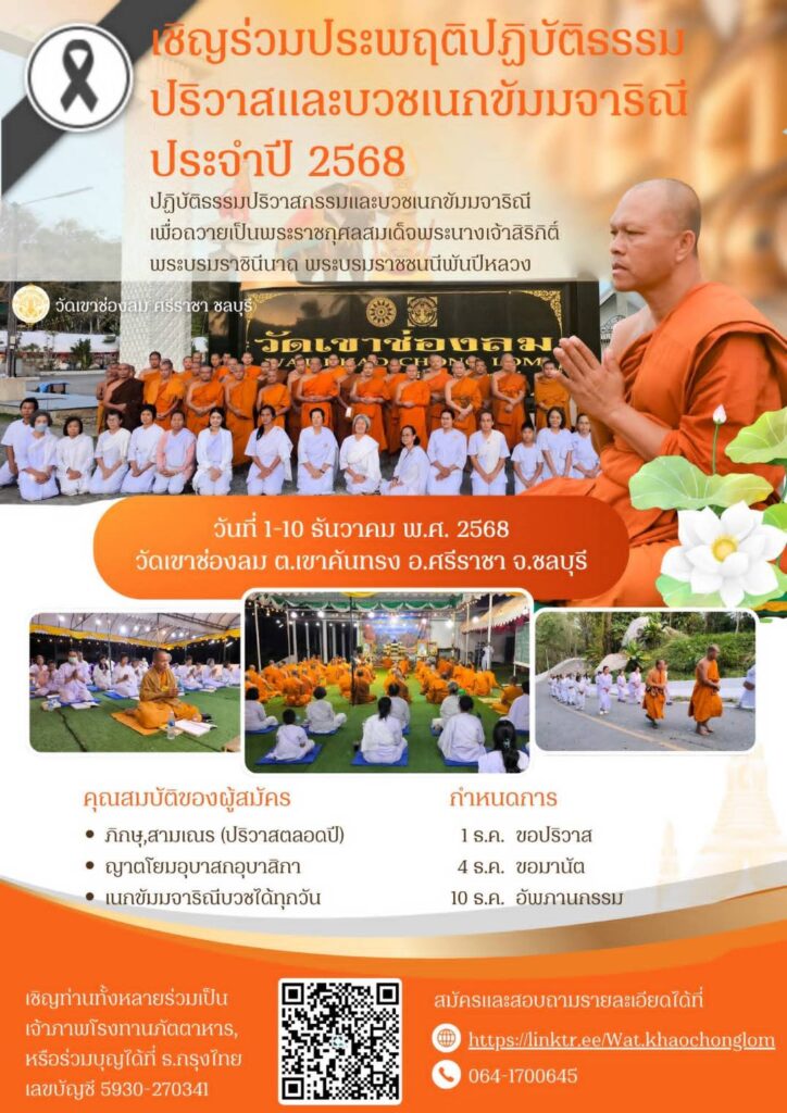 ขอเชิญร่วมสร้างมหากุศลถวายเป็นพระราชกุศลแด่ สมเด็จพระนางเจ้าสิริกิติ์ พระบรมราชินีนาถ พระบรมราชชนนีพันปีหลวง! วัดเขาช่องลม ต.เขาคันทรง อ.ศรีราชา โดย พระครูภาวนาวชิราลังการ วิ. เจ้าอาวาส ได้กราบนิมนต์พระสงฆ์ทั่วประเทศร่วม ประพฤติปริวาสกรรม และขอเชิญพุทธศาสนิกชนร่วม บวชศีลจาริณีปฏิบัติธรรม ประจำปี 2568 ระหว่างวันที่ 1-10 ธันวาคมนี้ เพื่อสืบสานพระพุทธศาสนา และน้อมรำลึกในพระมหากรุณาธิคุณอันหาที่สุดมิได้