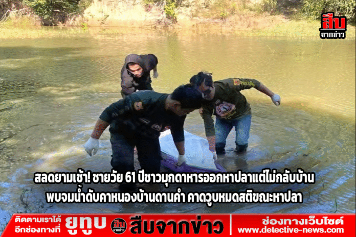เกิดเหตุเศร้ารับเช้าวันใหม่ที่จังหวัดมุกดาหาร ชายวัย 61 ปีออกหาปลาตั้งแต่เช้า แต่กลับไม่ถึงบ้าน ญาติตามหาพบกลายเป็นศพจมน้ำอยู่ในหนองบ้านดานคำ คาดเกิดวูบจากโรคประจำตัวขณะหาปลา