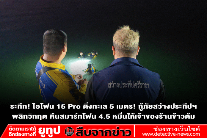เกือบไปแล้ว! เจ้าของร้านข้าวต้มปลาเกาะสีชัง บางพระ พลาดท่าทำโทรศัพท์มือถือ iPhone 15 Pro มูลค่ากว่า 45,000 บาท หล่นลงทะเลลึกประมาณ 5 เมตร ขณะขนของขึ้นเรือที่ท่าเทียบเรือเกาะลอย-เกาะสีชัง แจ้งขอความช่วยเหลือฉุกเฉินจากหน่วยกู้ภัยสว่างประทีปศรีราชา ส่งทีมประดาน้ำชุด “สมุทรดำ” ลงปฏิบัติการค้นหาใต้น้ำทันที ใช้เวลาเพียง 10 นาที ก็สามารถงมมือถือเครื่องหรูขึ้นมาคืนเจ้าของได้สำเร็จ สร้างความปลาบปลื้มใจให้ผู้ประสบเหตุและครอบครัวเป็นอย่างมาก