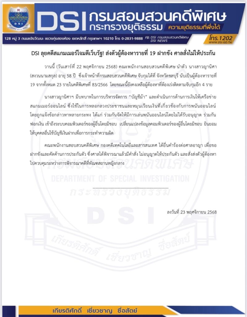 กรมสอบสวนคดีพิเศษ (DSI) เดินหน้ากวาดล้างเครือข่ายอาชญากรรมทางเทคโนโลยีอย่างไม่ลดละ ล่าสุดจับกุม นางสาวญานิศา อายุ 58 ปี ผู้ต้องหารายที่ 19 จากทั้งหมด 23 ราย ในคดีพิเศษที่ 83/2566 ซึ่งมีบทบาทสำคัญในการ บริหารจัดการ “บัญชีม้า” และการเงินให้เครือข่ายสแกมเมอร์ที่โจมตีระบบคอมพิวเตอร์ภาครัฐ หลัง DSI นำตัวส่งศาลอาญาเพื่อฝากขัง ศาลพิจารณาแล้วมีคำสั่ง ไม่อนุญาตให้ประกันตัว เนื่องจากเป็นคดีที่มีความร้ายแรงและซับซ้อน มุ่งทำลายรากฐานความมั่นคงทางระบบคอมพิวเตอร์และหลอกลวงประชาชน