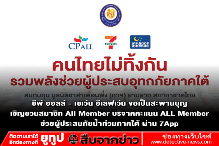 ซีพี ออลล์ และ เซเว่น อีเลฟเว่น พร้อมอยู่เคียงข้างพี่น้องชาวไทยทุกคน เพราะ “คนไทยไม่ทิ้งกัน” ขอเชิญชวนทุกคนร่วมส่งต่อพลังน้ำใจ แม้เพียงเล็กน้อยก็มีความหมายต่อผู้ประสบภัยอย่างยิ่ง เพราะทุกคะแนนที่คุณให้คือกำลังใจส่งให้พี่น้องผู้ประสบภัยทุกคน