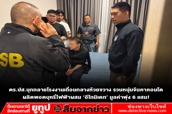 ตำรวจปราบปรามยาเสพติด (ปส.) เปิดปฏิบัติการทลายแหล่งผลิตสิ่งผิดกฎหมายกลางกรุง บุกเข้าจับกุมชายชาวจีน อายุ 30 ปี ภายในคอนโดมิเนียมย่านห้วยขวาง หลังพบว่าเปิดเป็น โรงงานผลิตพอตบุหรี่ไฟฟ้าผสมสารอีโทมิเดท ซึ่งเป็นวัตถุออกฤทธิ์ต่อจิตประสาทประเภท 2 ยึดของกลางพอตพร้อมใช้กว่า 1,000 ชิ้น มูลค่ารวมกว่า 600,000 บาท ขยายผลจากการจับกุมที่พัทยา ชี้เป็นยาเสพติดกำลังแพร่ระบาดอย่างหนักในจีน ต้องเร่ง “ตัดไฟแต่ต้นลม” ป้องกันไม่ให้เข้าสู่ตลาดไทย