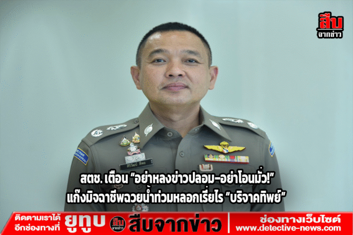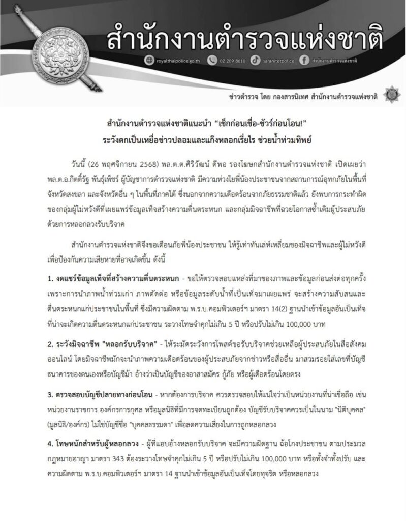 สำนักงานตำรวจแห่งชาติออกโรงเตือนประชาชน “เช็กก่อนเชื่อ–ชัวร์ก่อนโอน” หลังพบมิจฉาชีพฉวยโอกาสสถานการณ์น้ำท่วมภาคใต้ หลอกโพสต์รับบริจาคช่วยผู้ประสบภัยปลอม พร้อมขู่เอาผิดหนักทั้งคดีฉ้อโกงและ พ.ร.บ.คอมพิวเตอร์ โทษจำคุกสูงสุด 5 ปี