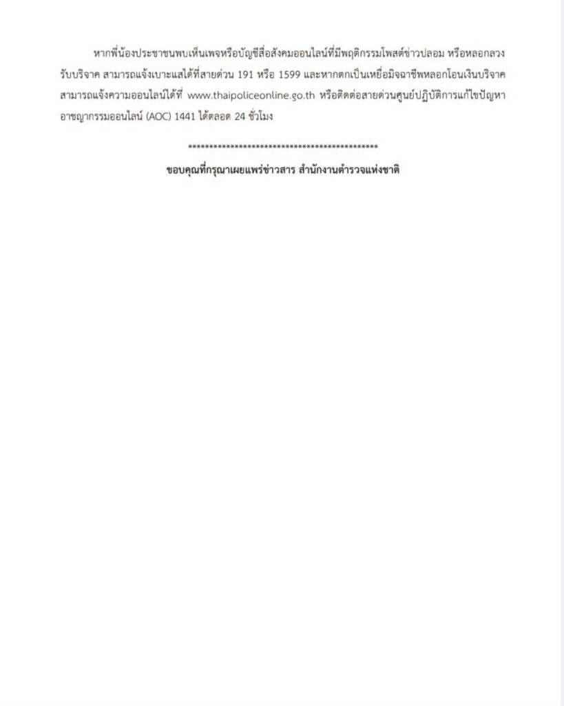 - ศูนย์ปฏิบัติการแก้ไขปัญหาอาชญากรรมออนไลน์ (AOC) โทร. 1441 ตลอด 24 ชั่วโมง
